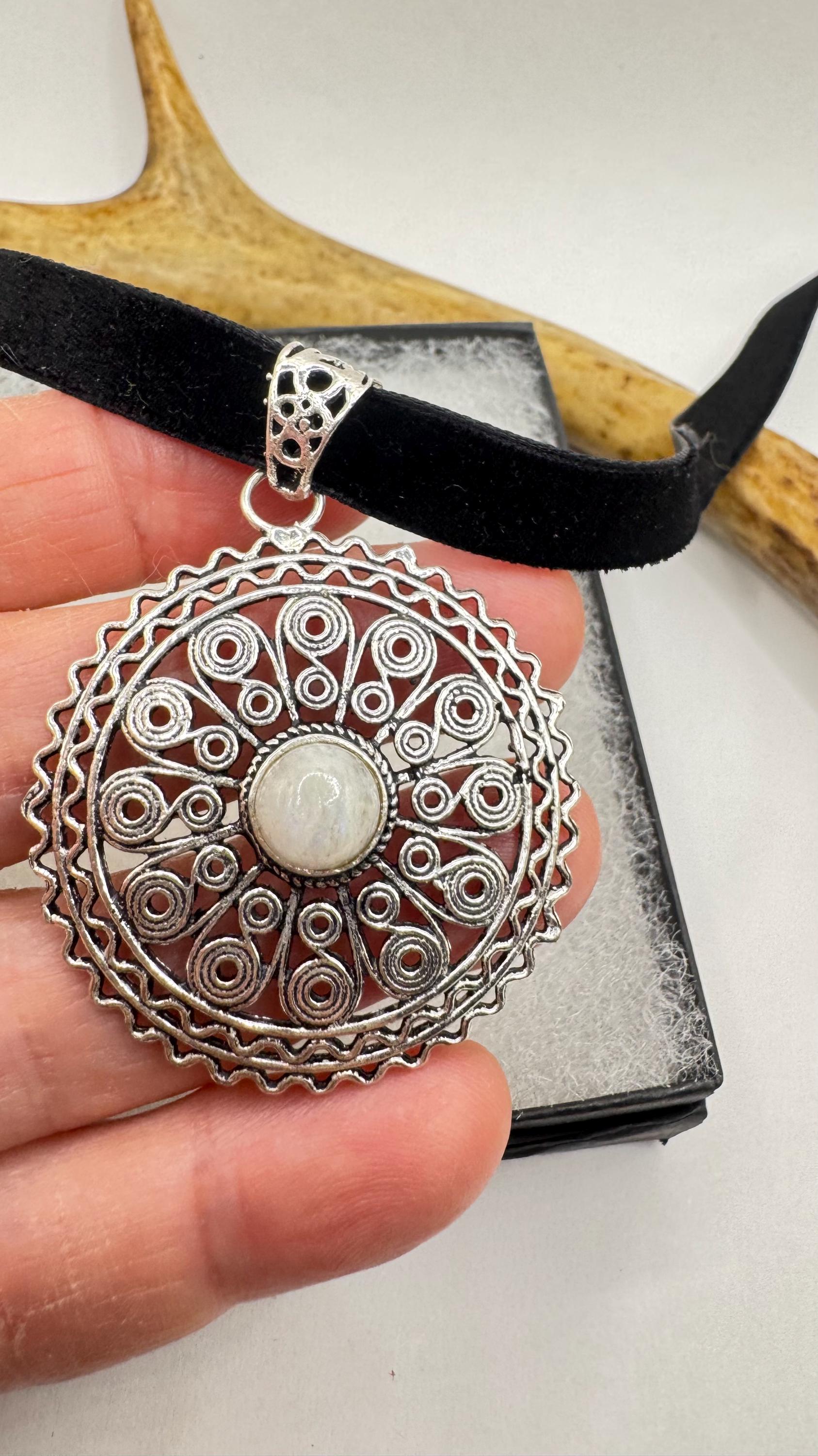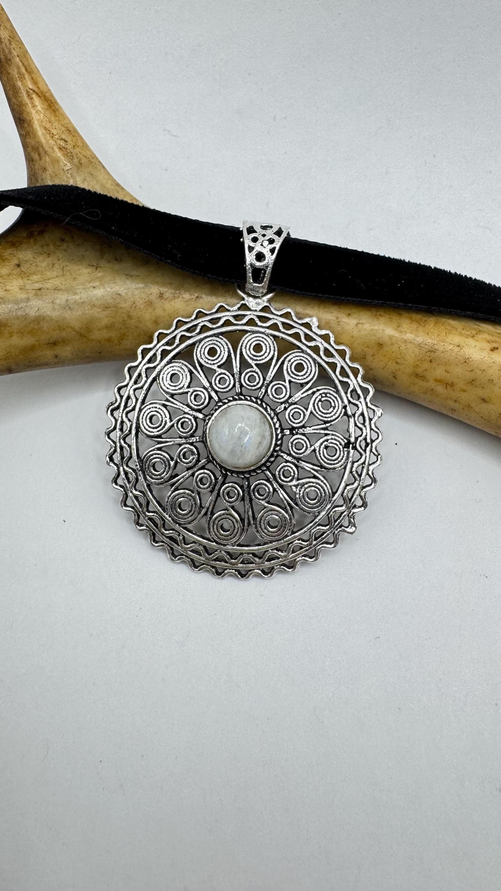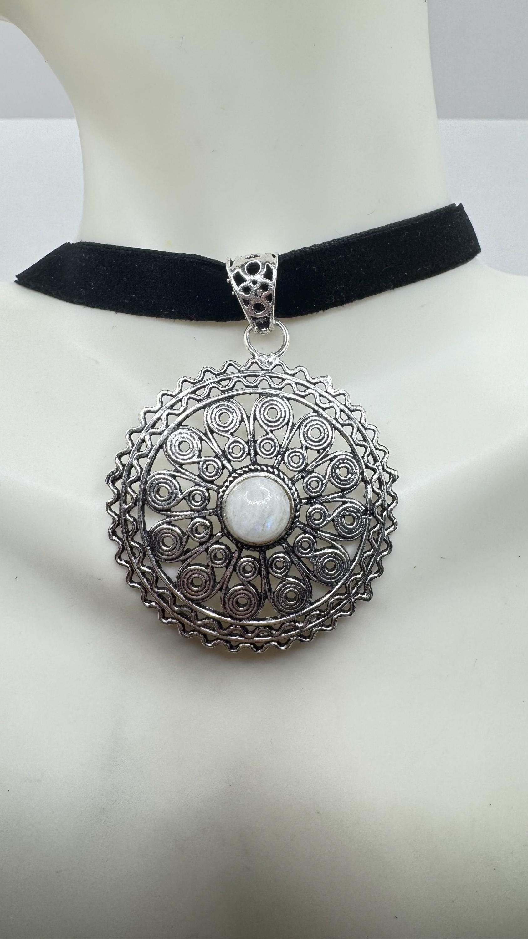 Vintage Silver Bronze Rainbow Moonstone Black Velvet Choker Pendant Necklace