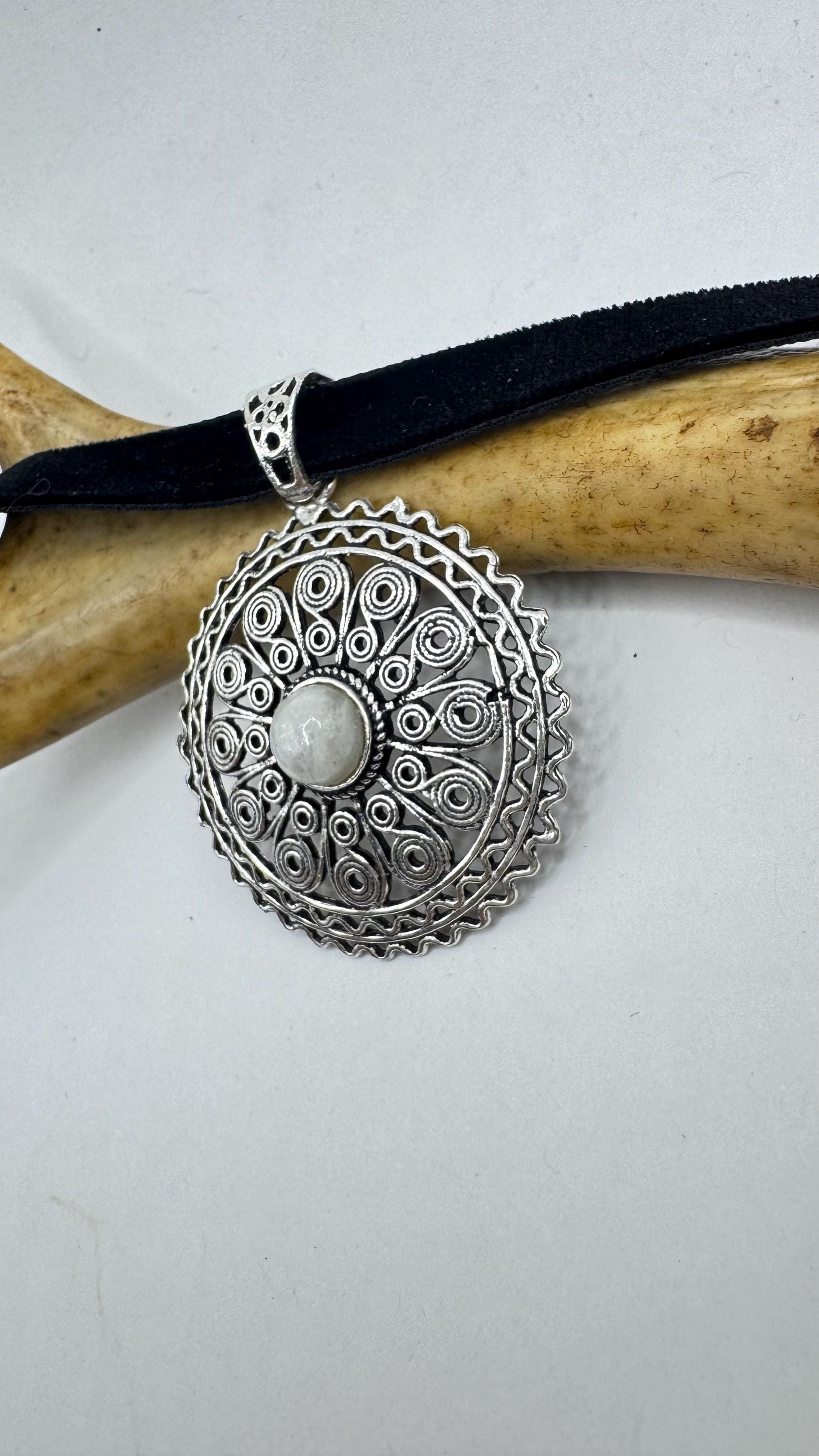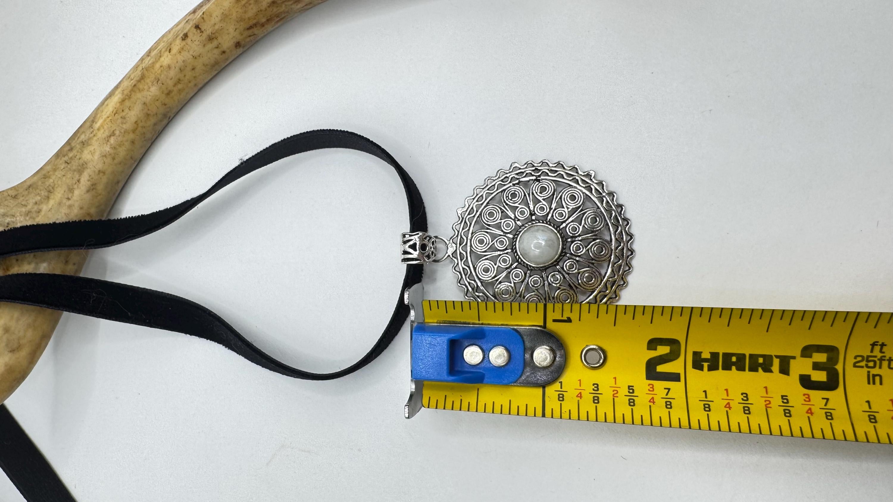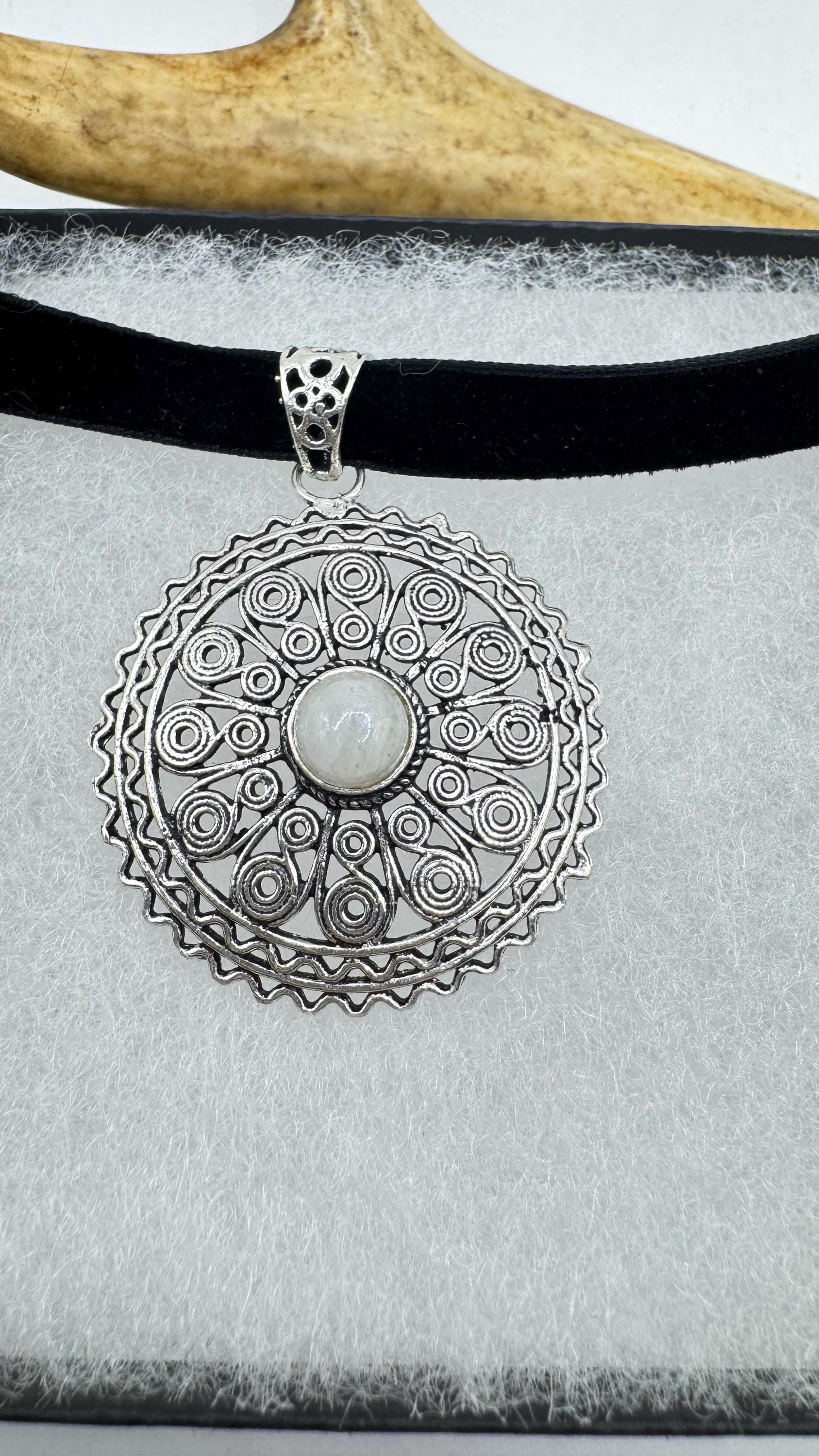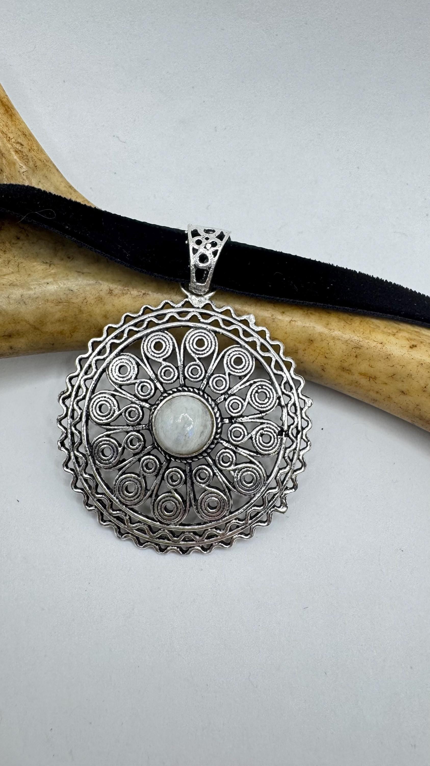 Vintage Silver Bronze Rainbow Moonstone Black Velvet Choker Pendant Necklace