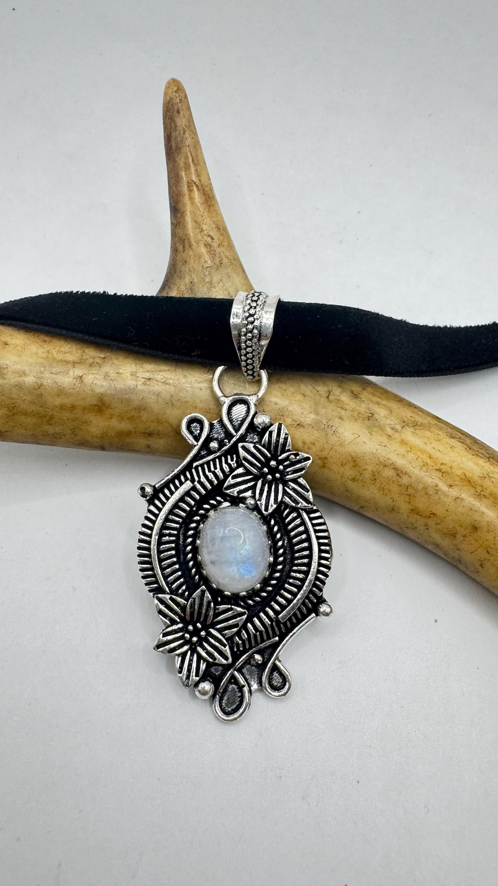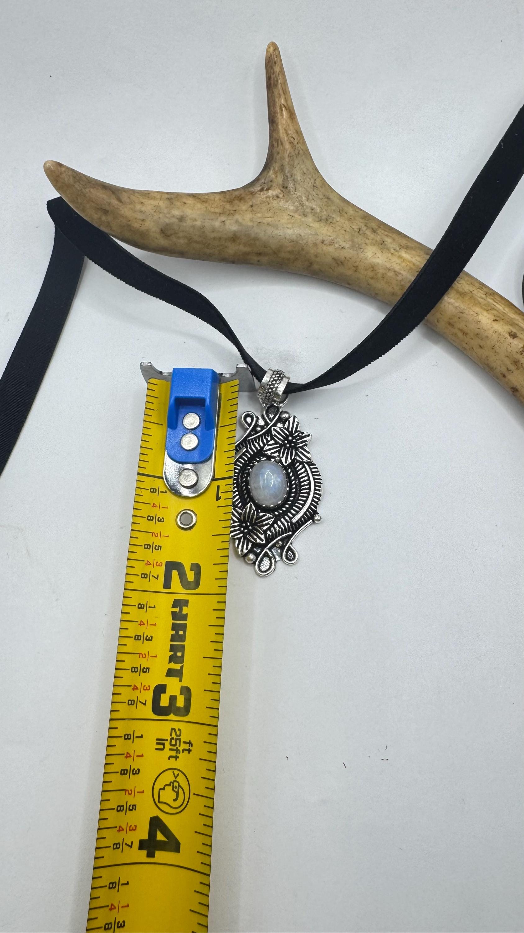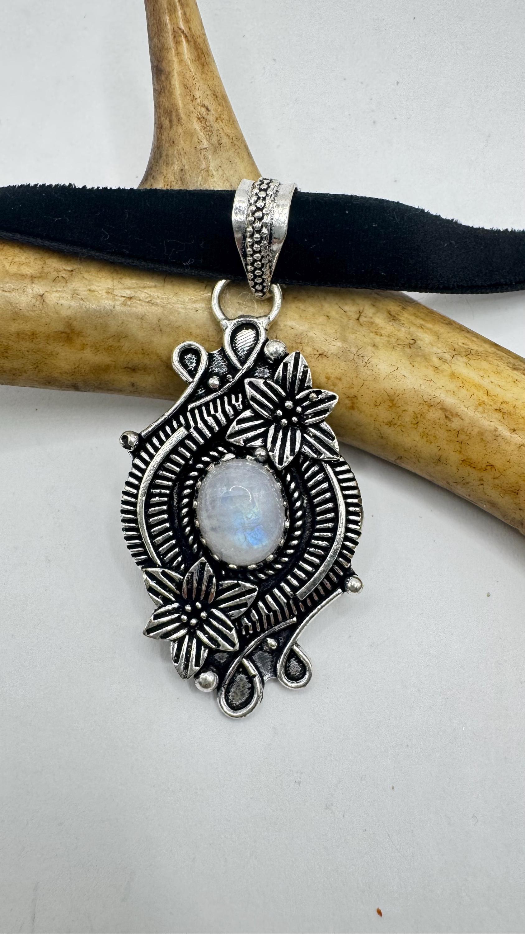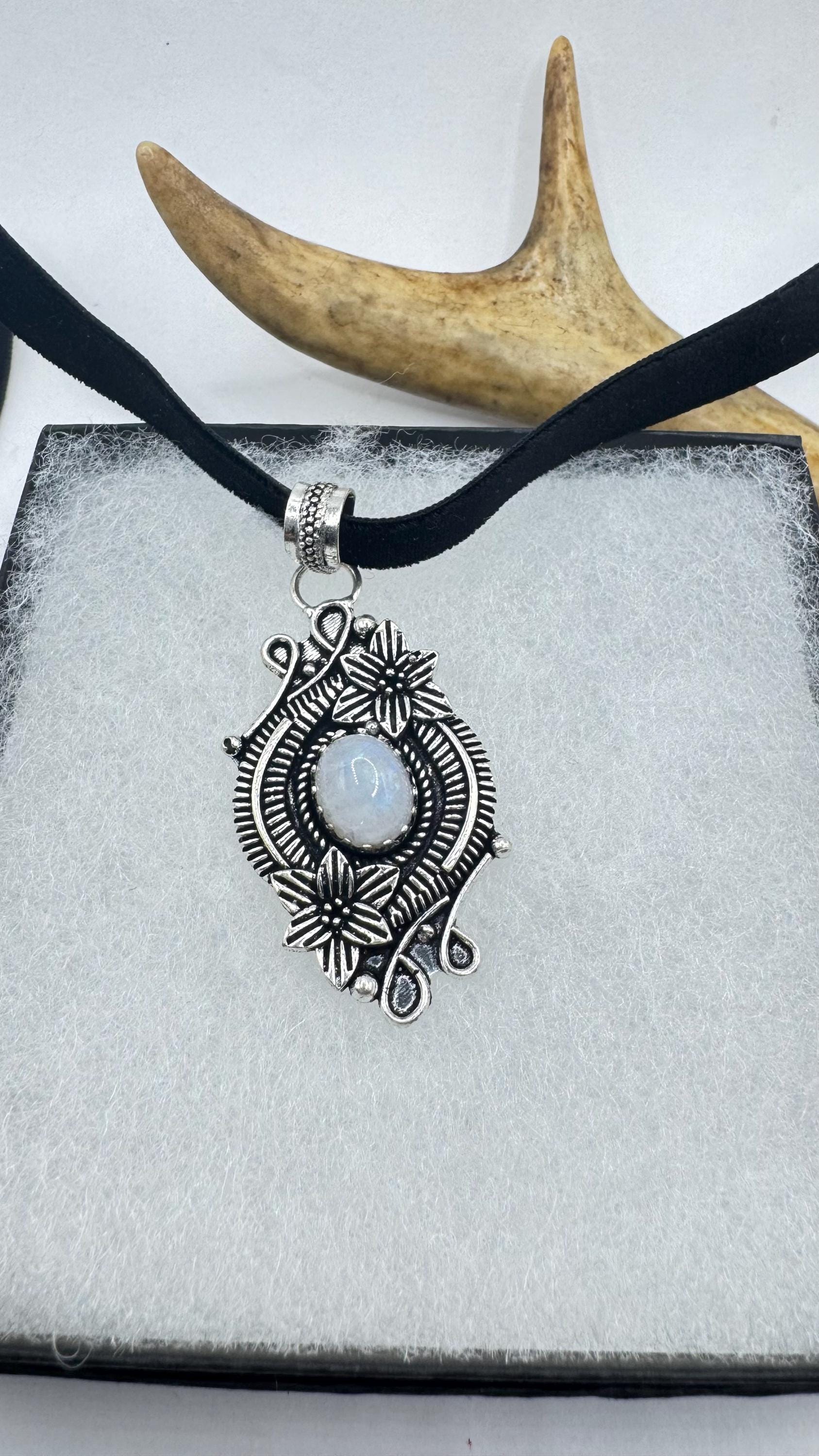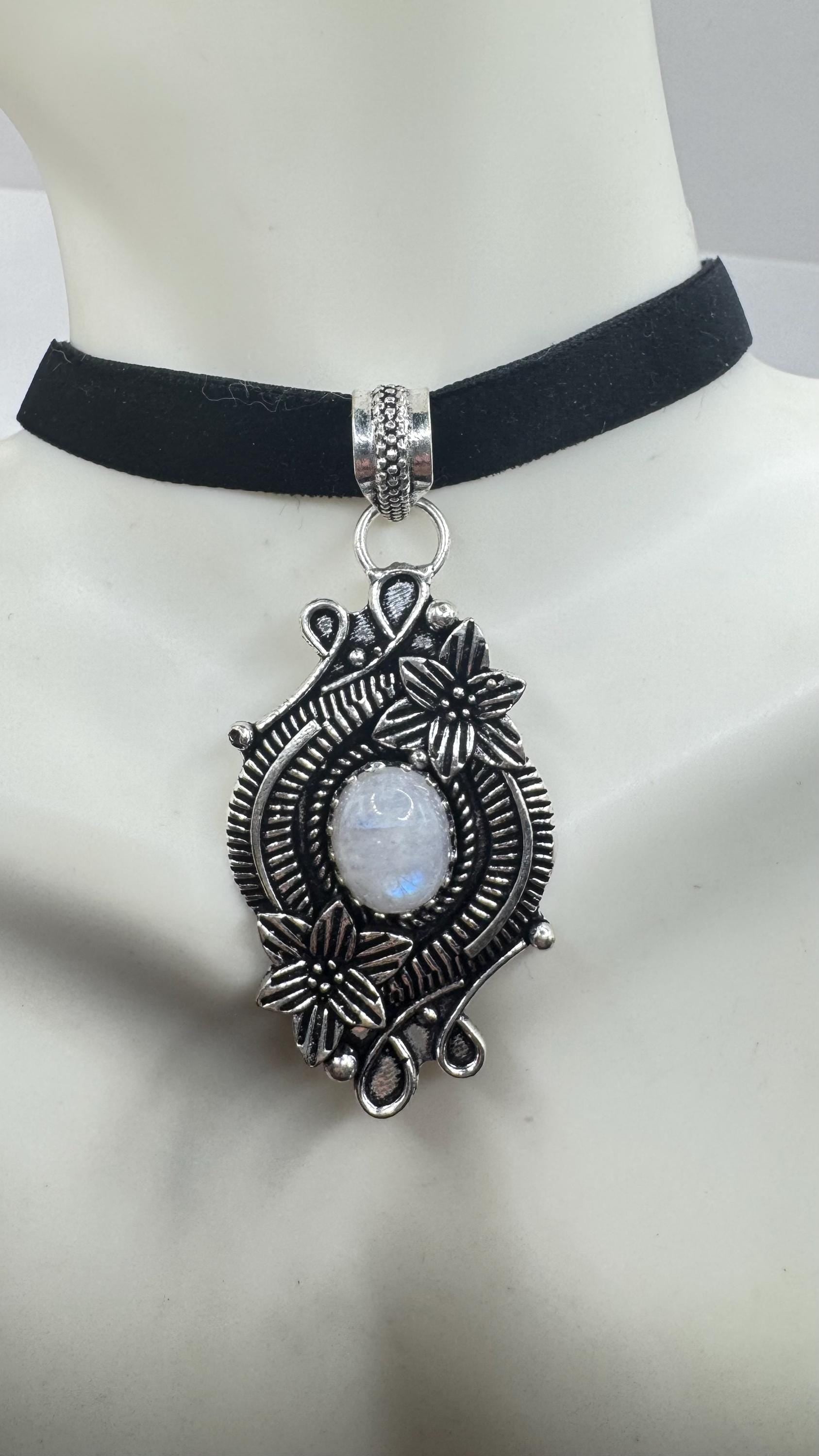 Vintage Silver Bronze Rainbow Moonstone Black Velvet Choker Pendant Necklace