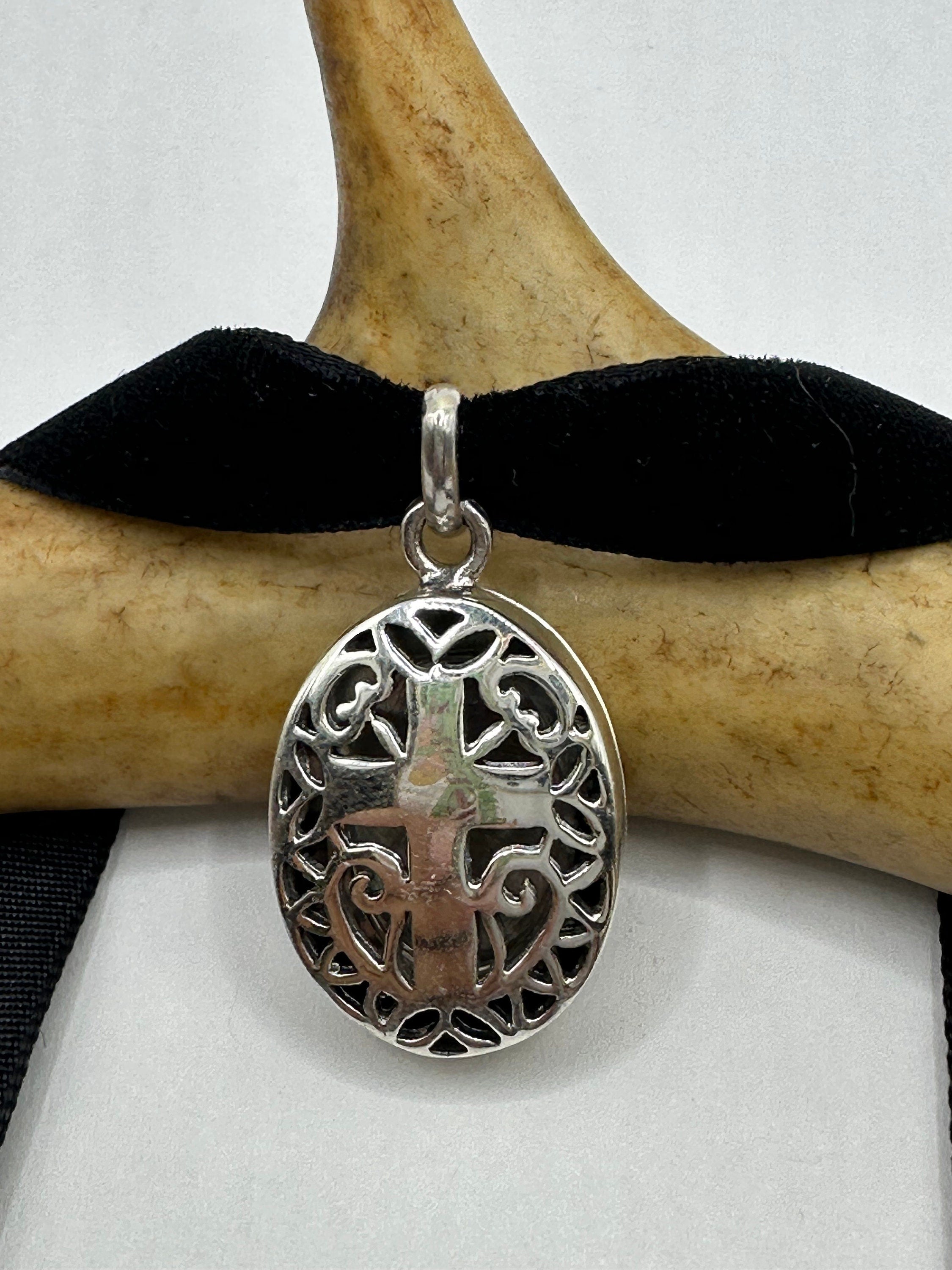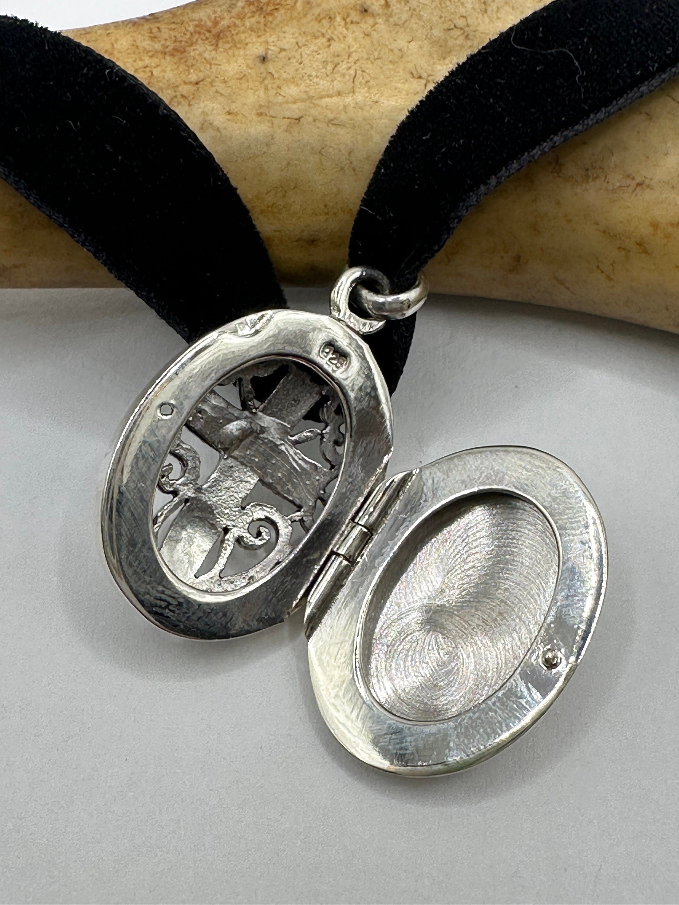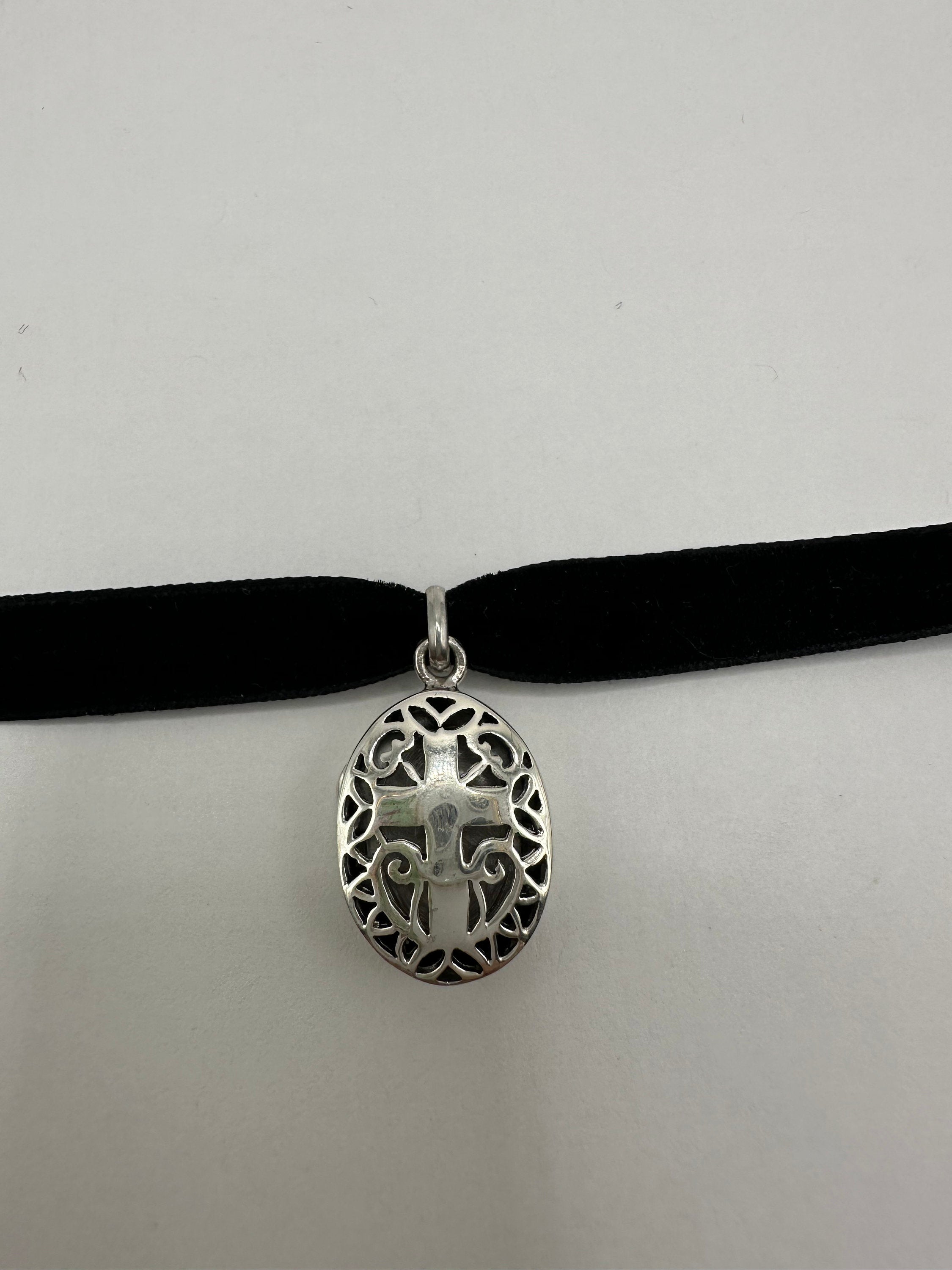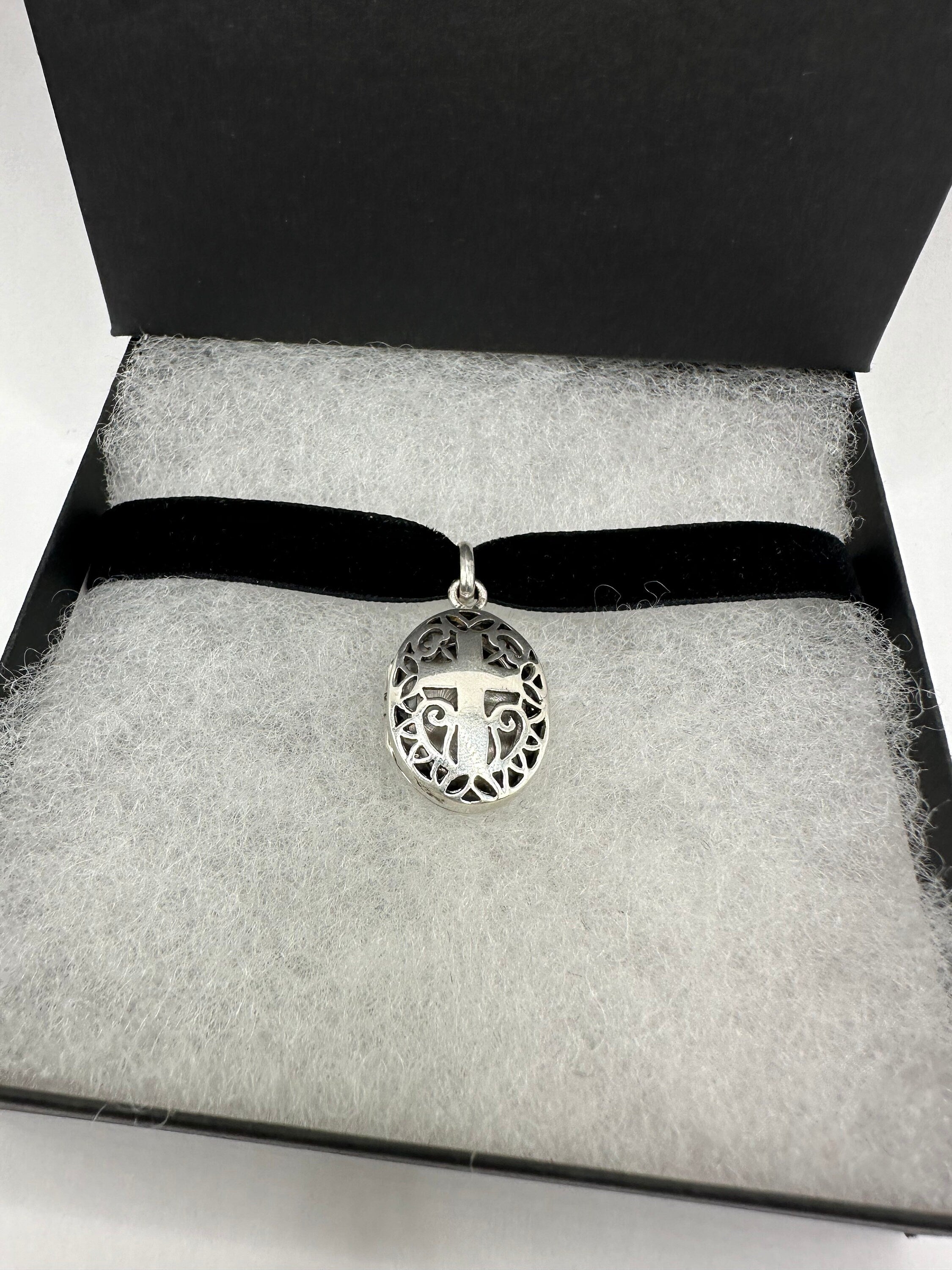 Vintage Silver Locket features a large oval Photo Pendant with a detailed etched cross design. Hand repolished, this treasure can... Read more