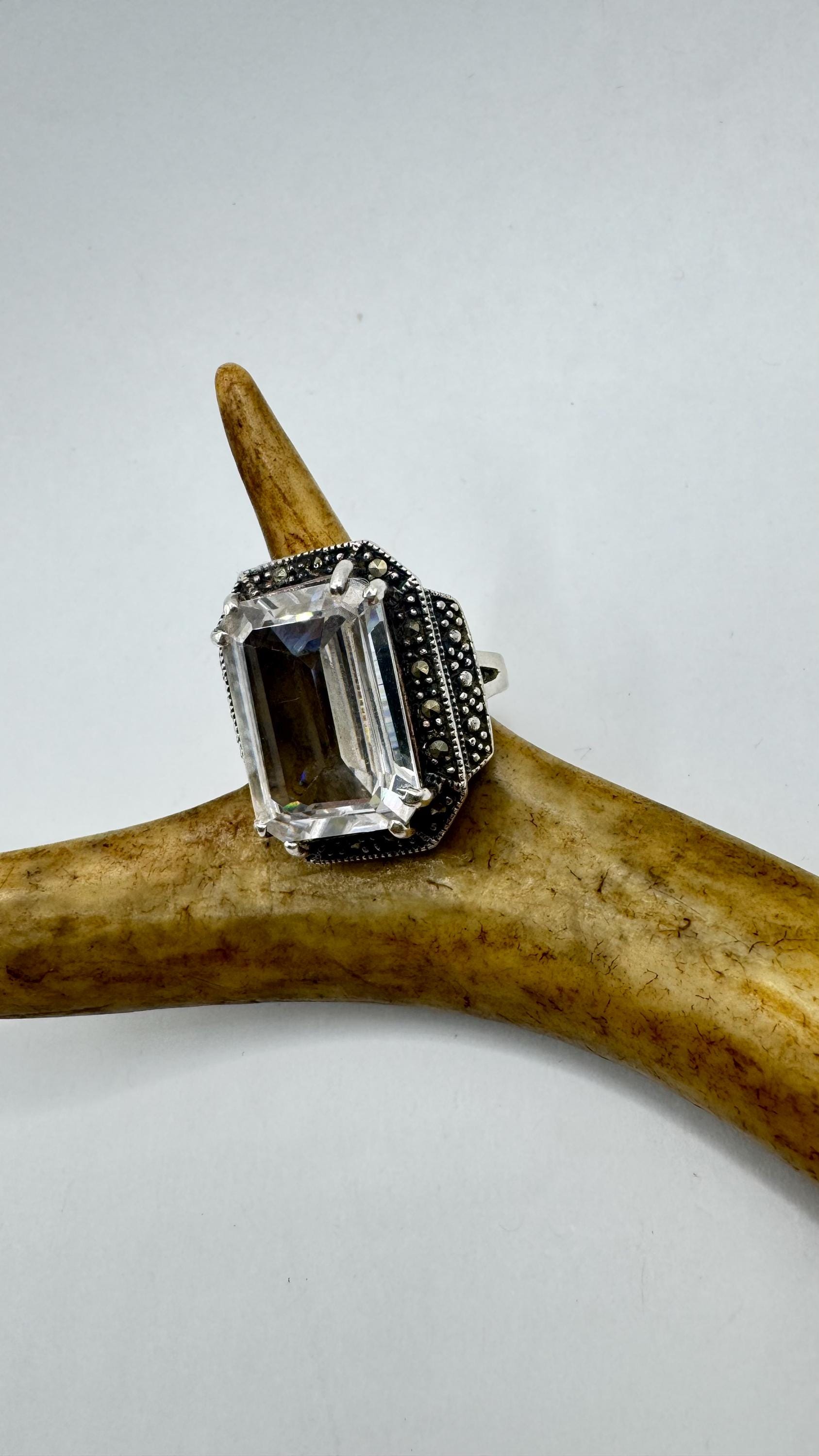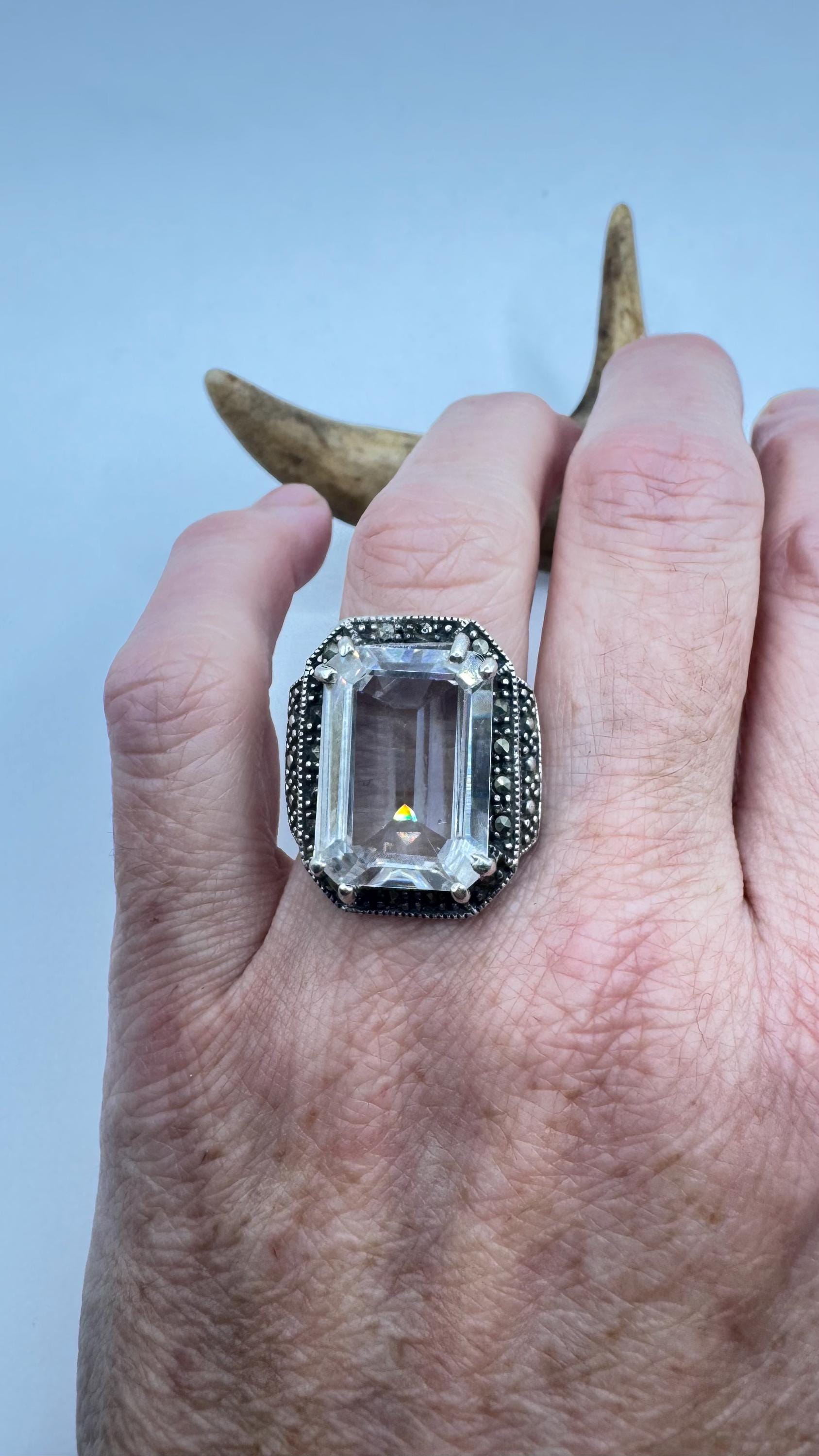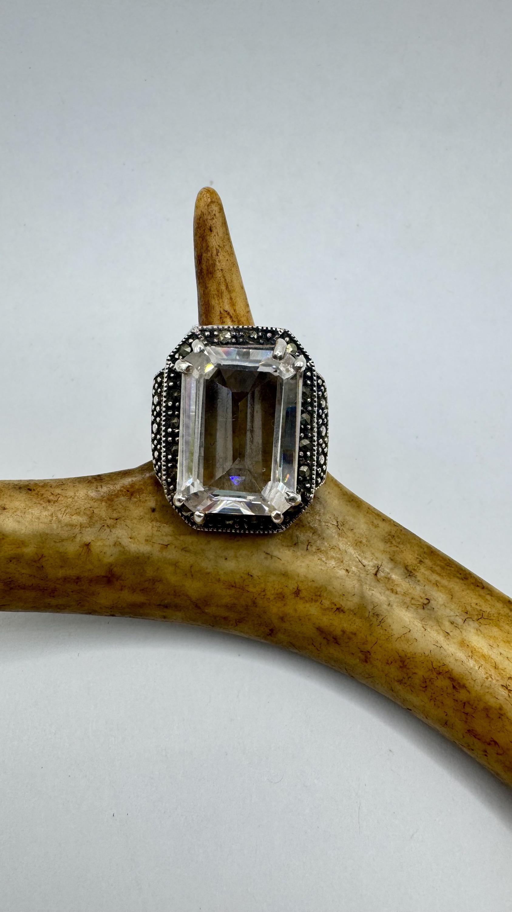 Vintage Silver Ring | Large Clear CZ Marcasite Promise Ring - 925 Sterling Silver Jewelry for Prom Wedding