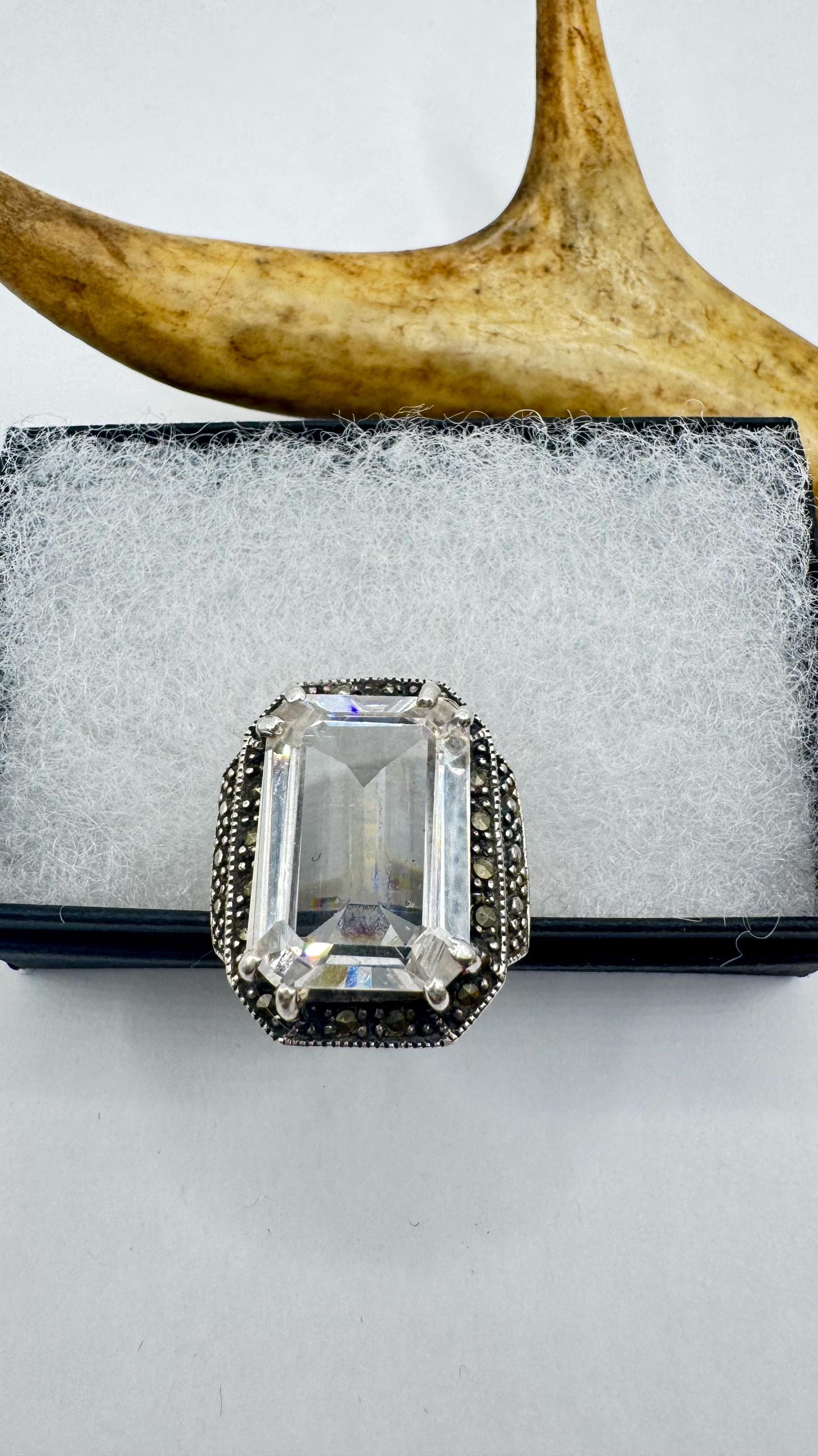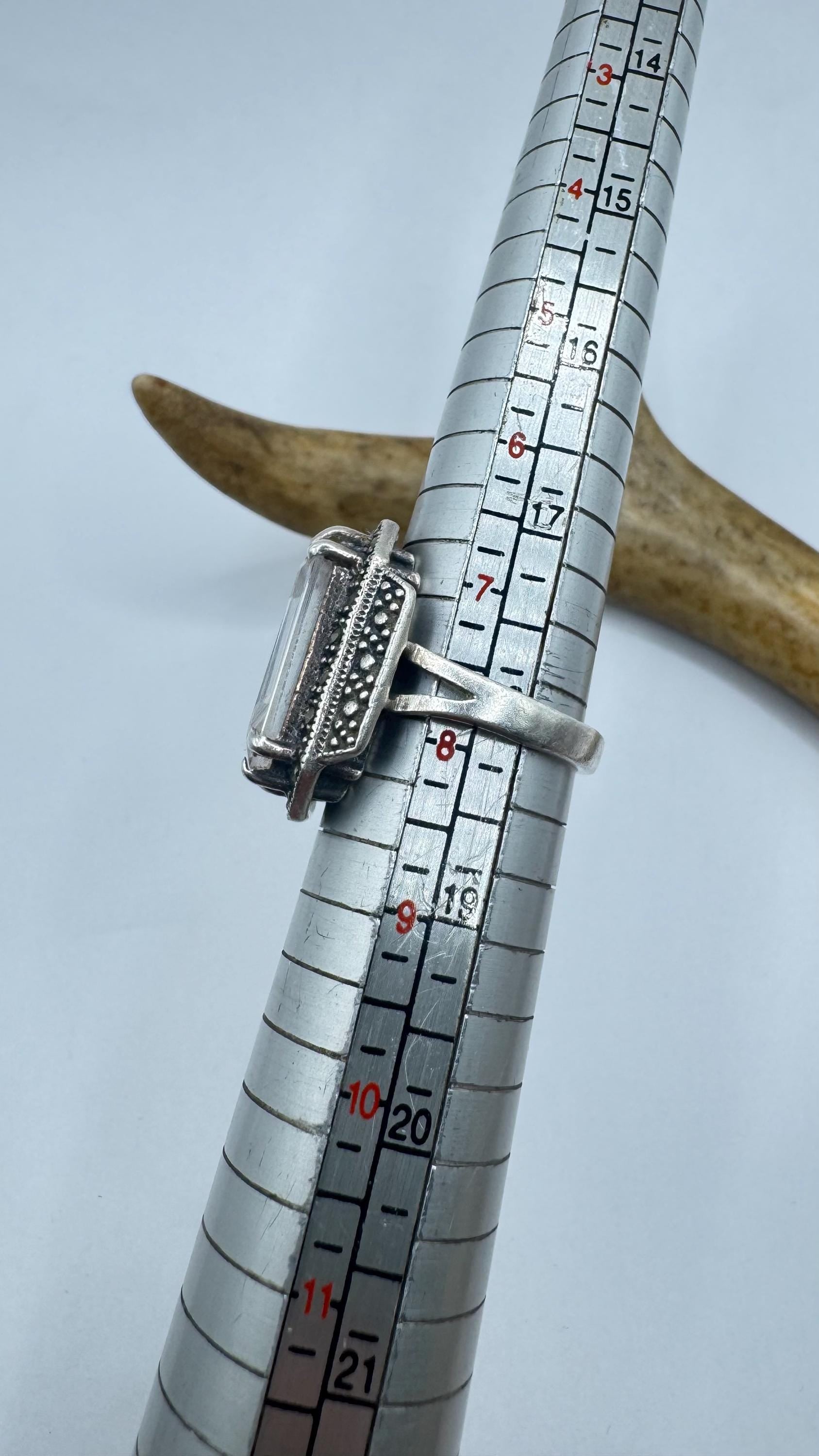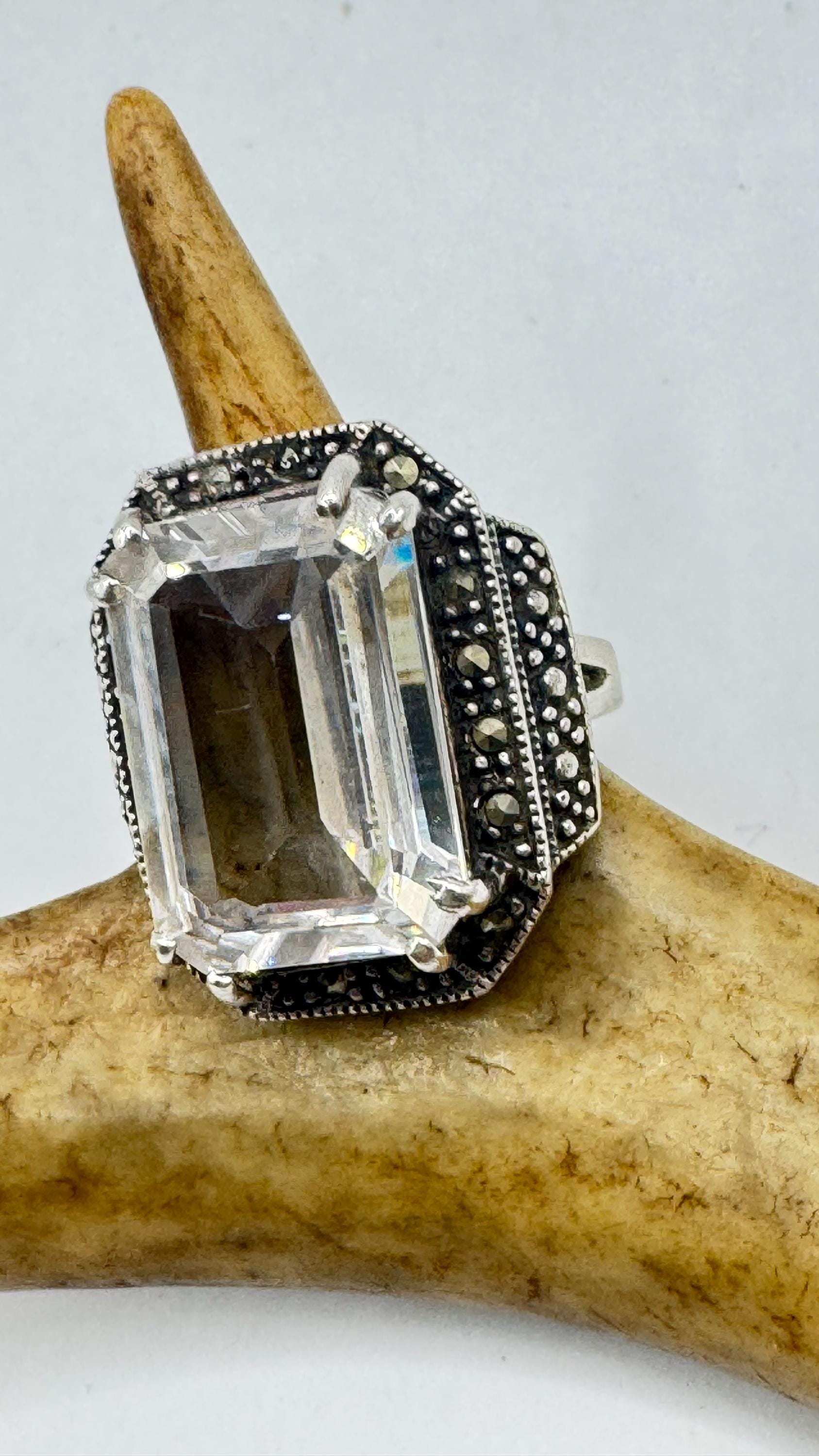 Vintage Silver Ring | Large Clear CZ Marcasite Promise Ring - 925 Sterling Silver Jewelry for Prom Wedding