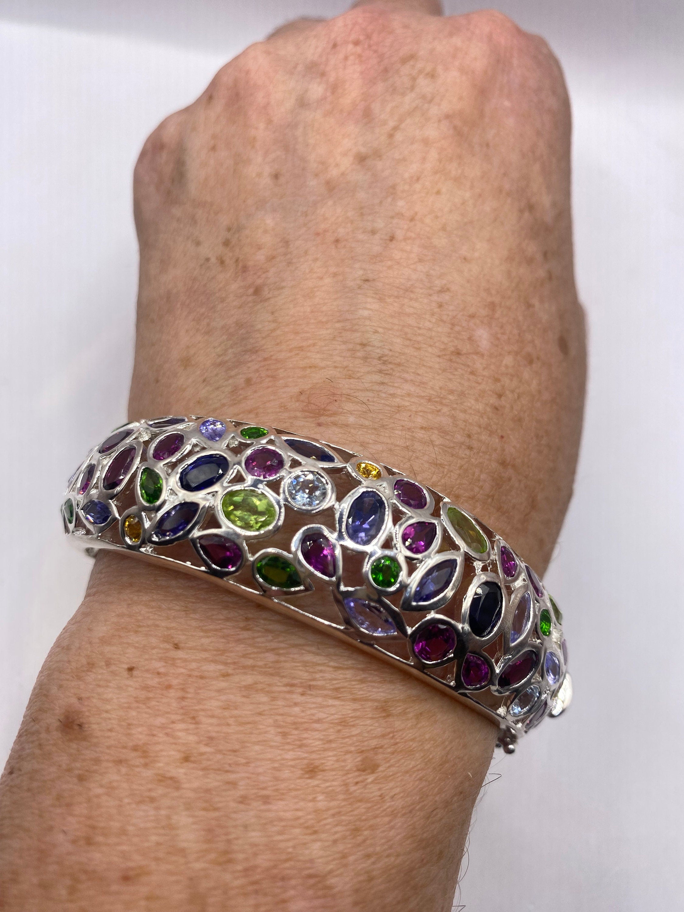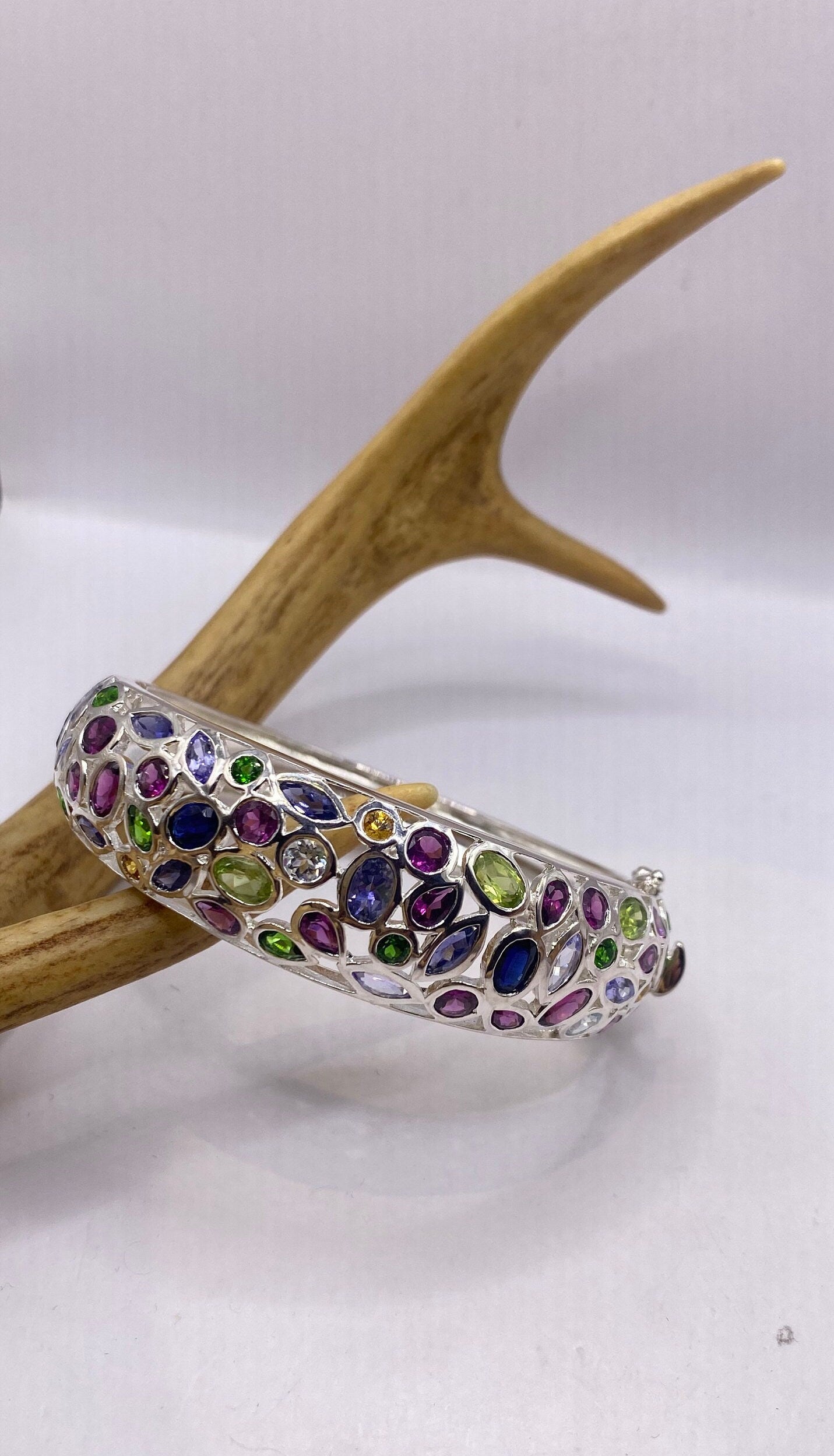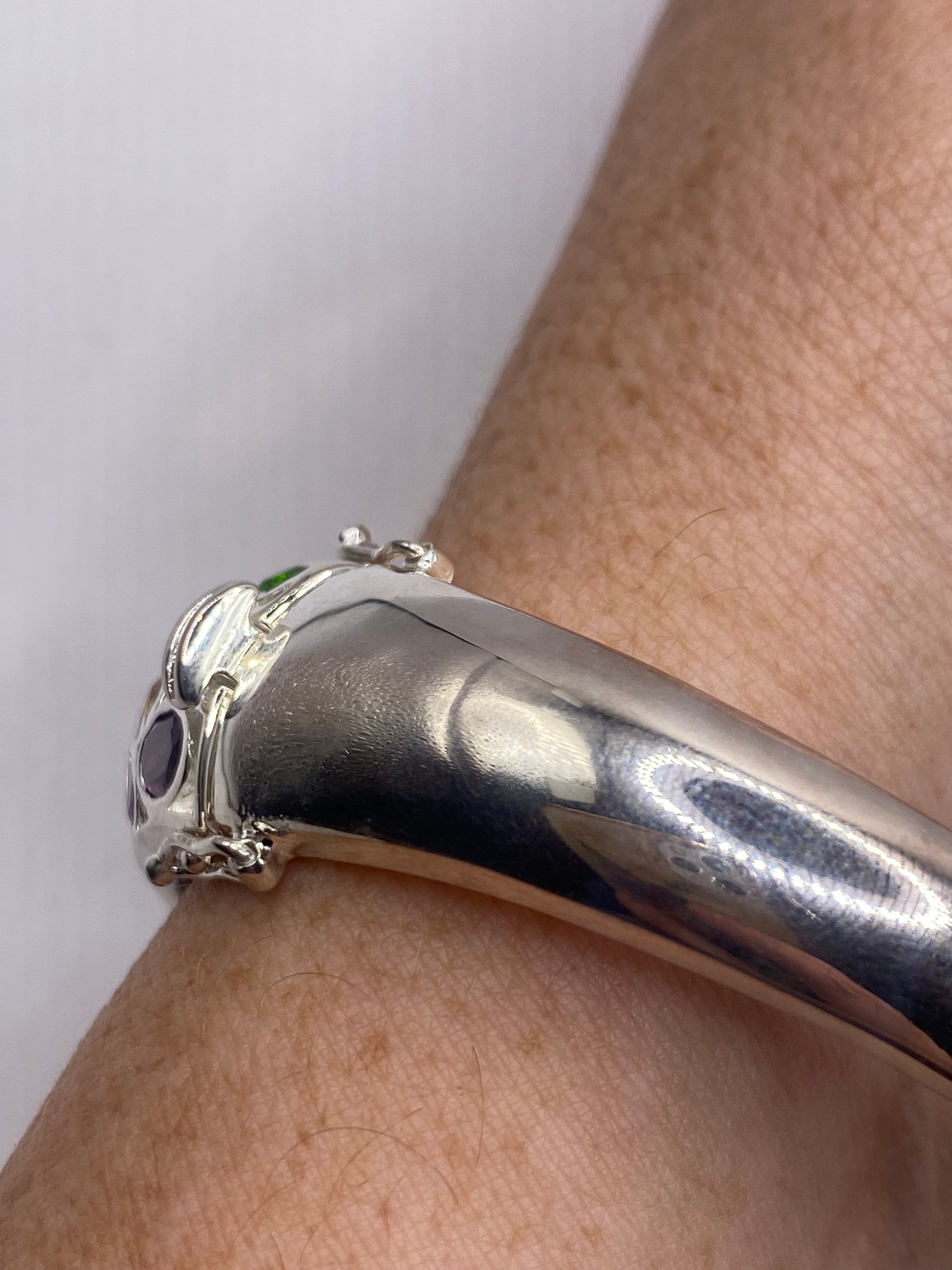 Vintage Sterling Silver Gemstone Bangle | Iolite, Blue Topaz, Peridot, Amethyst, Tourmaline Cuff | 925