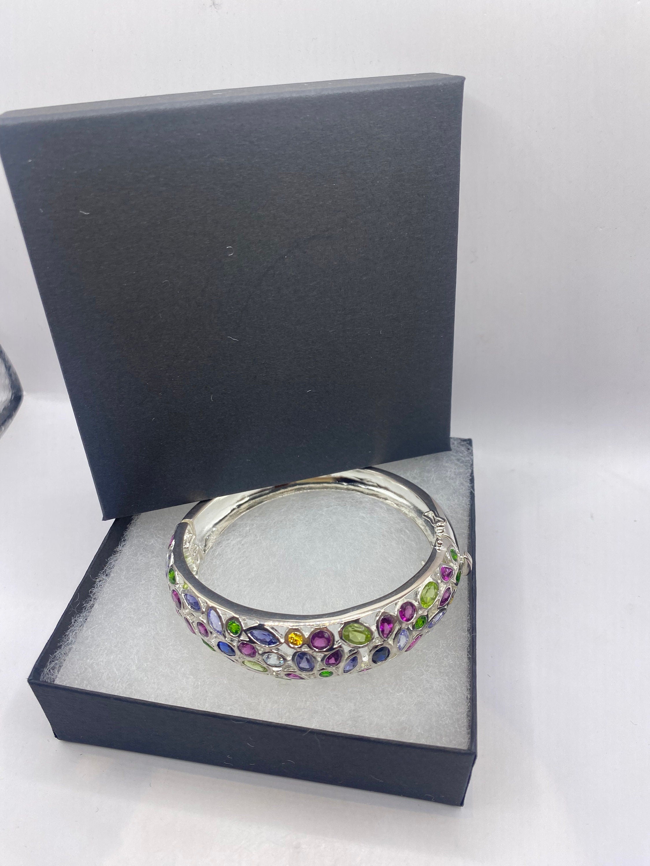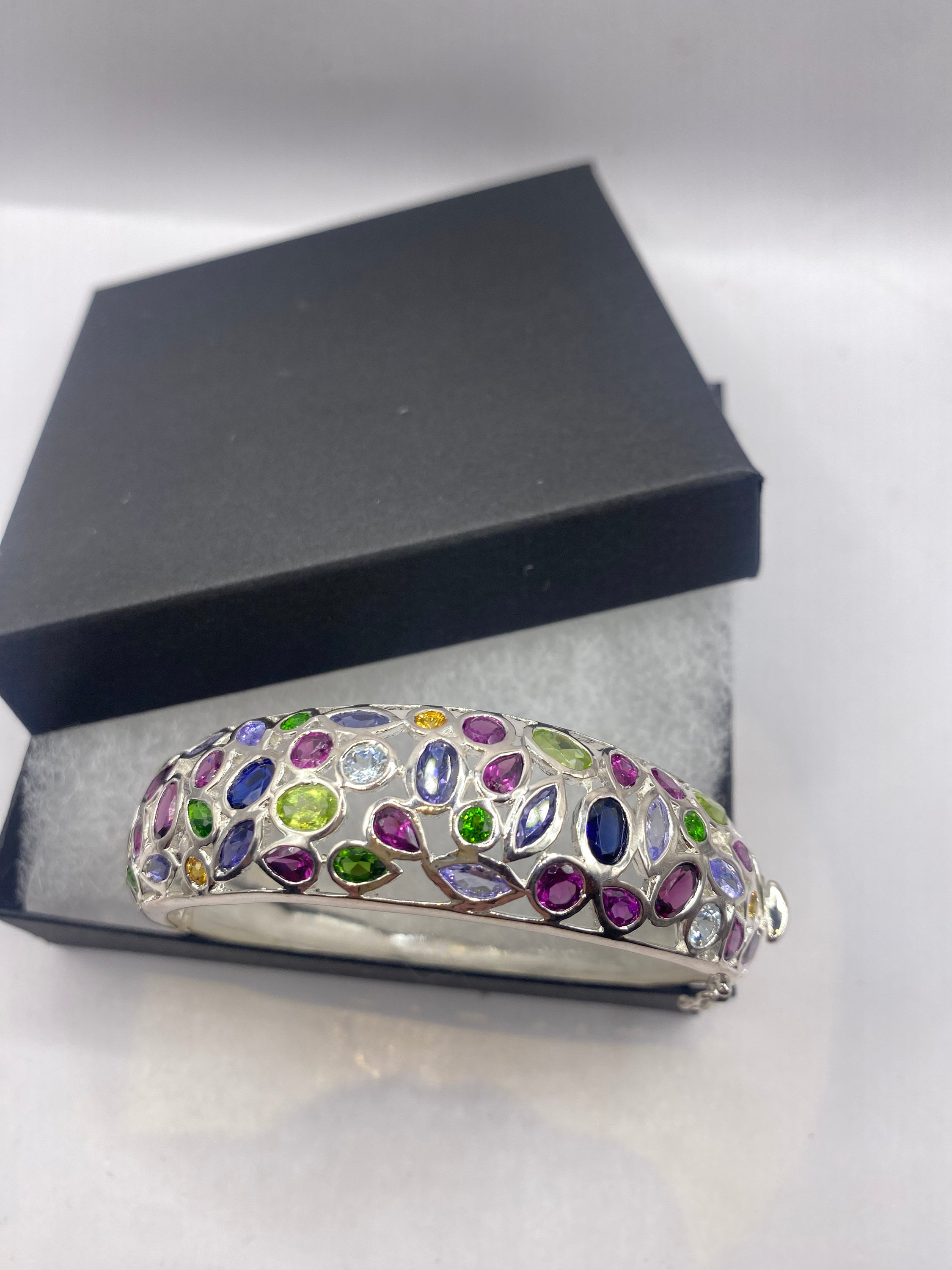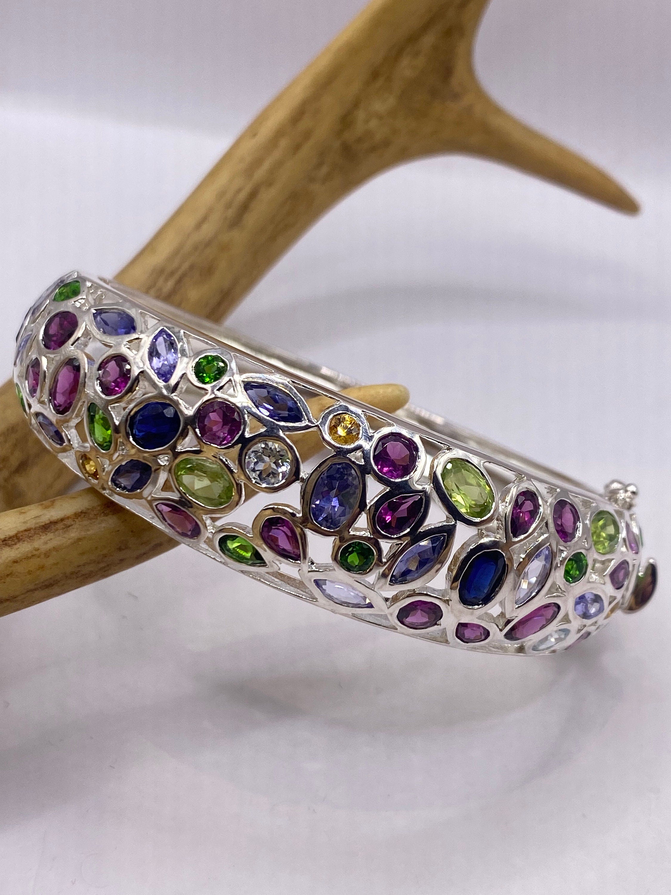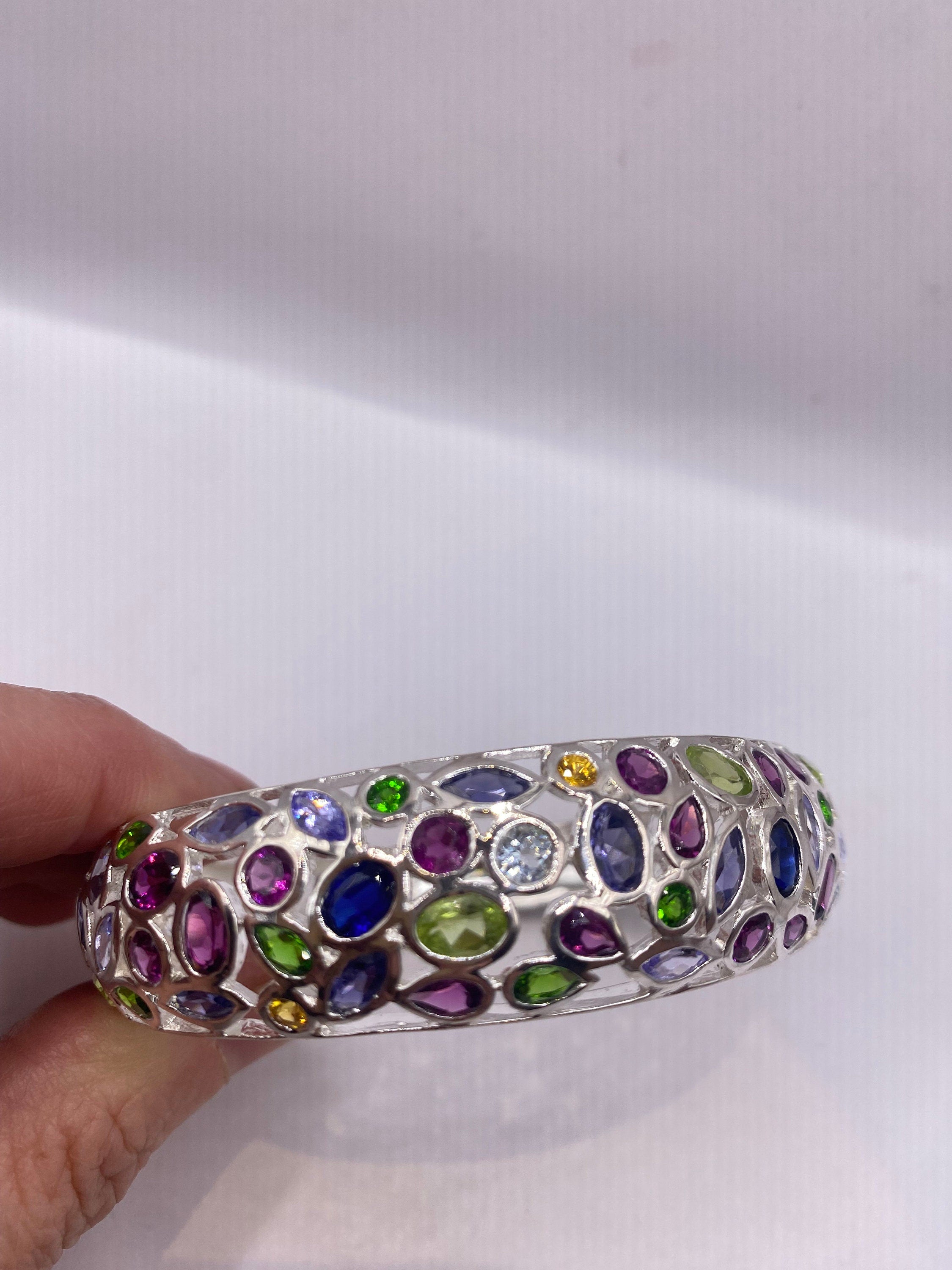 Vintage Sterling Silver Gemstone Bangle | Iolite, Blue Topaz, Peridot, Amethyst, Tourmaline Cuff | 925