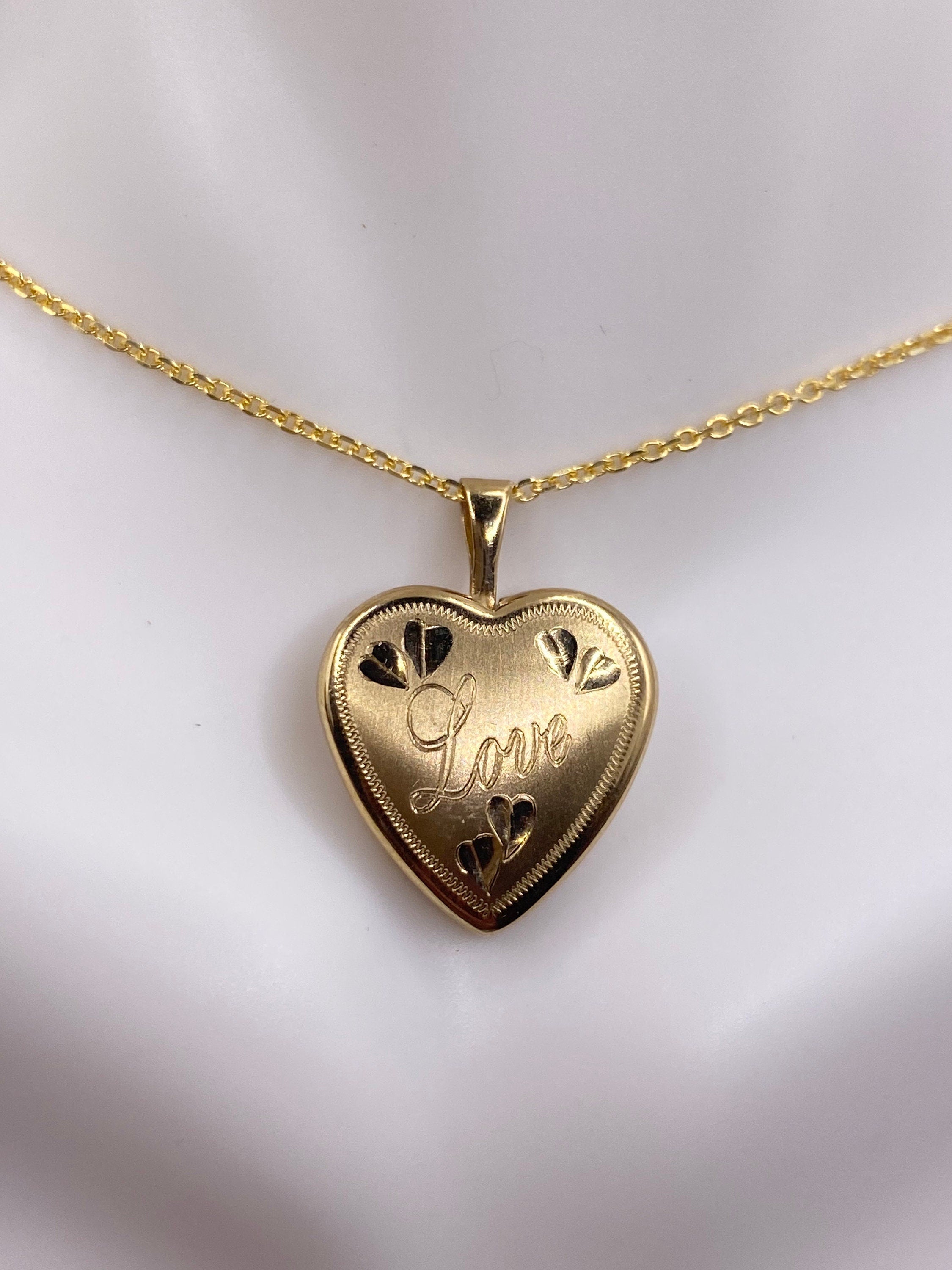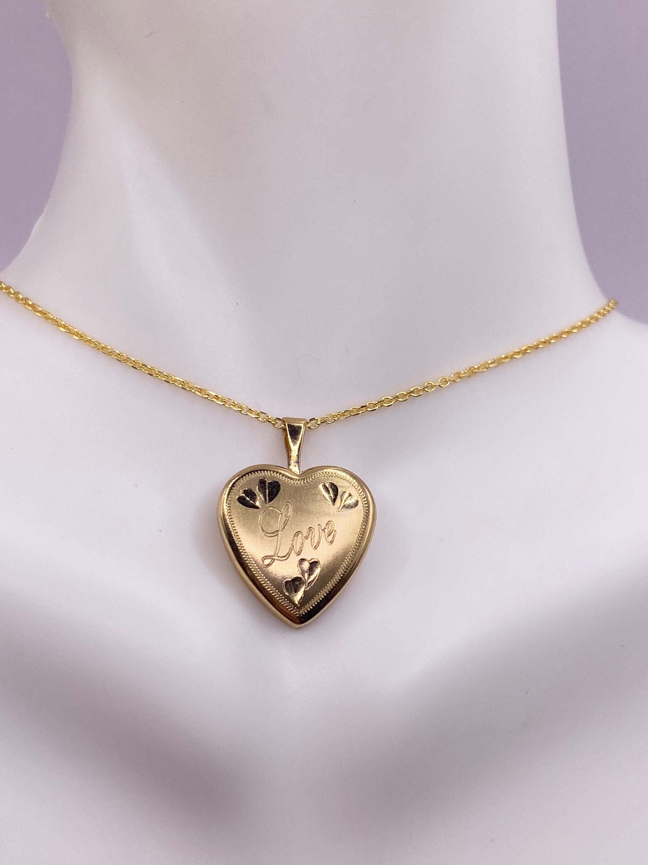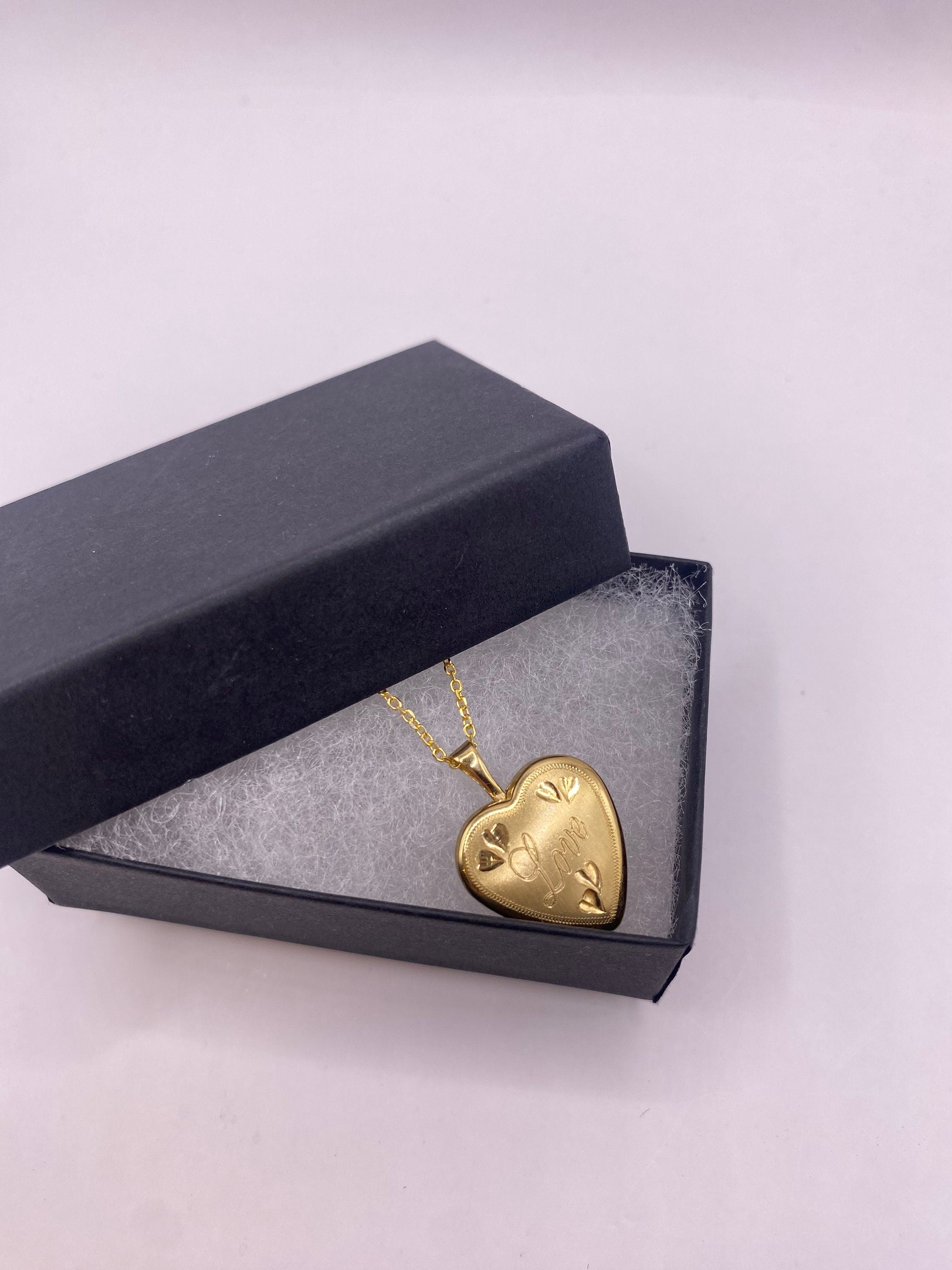 Vintage Tiny Gold Heart Photo Locket 9K Gold Filled Memory Charm Engraved with "Love" on Delicate Chain - Vintage Style Photo Necklace