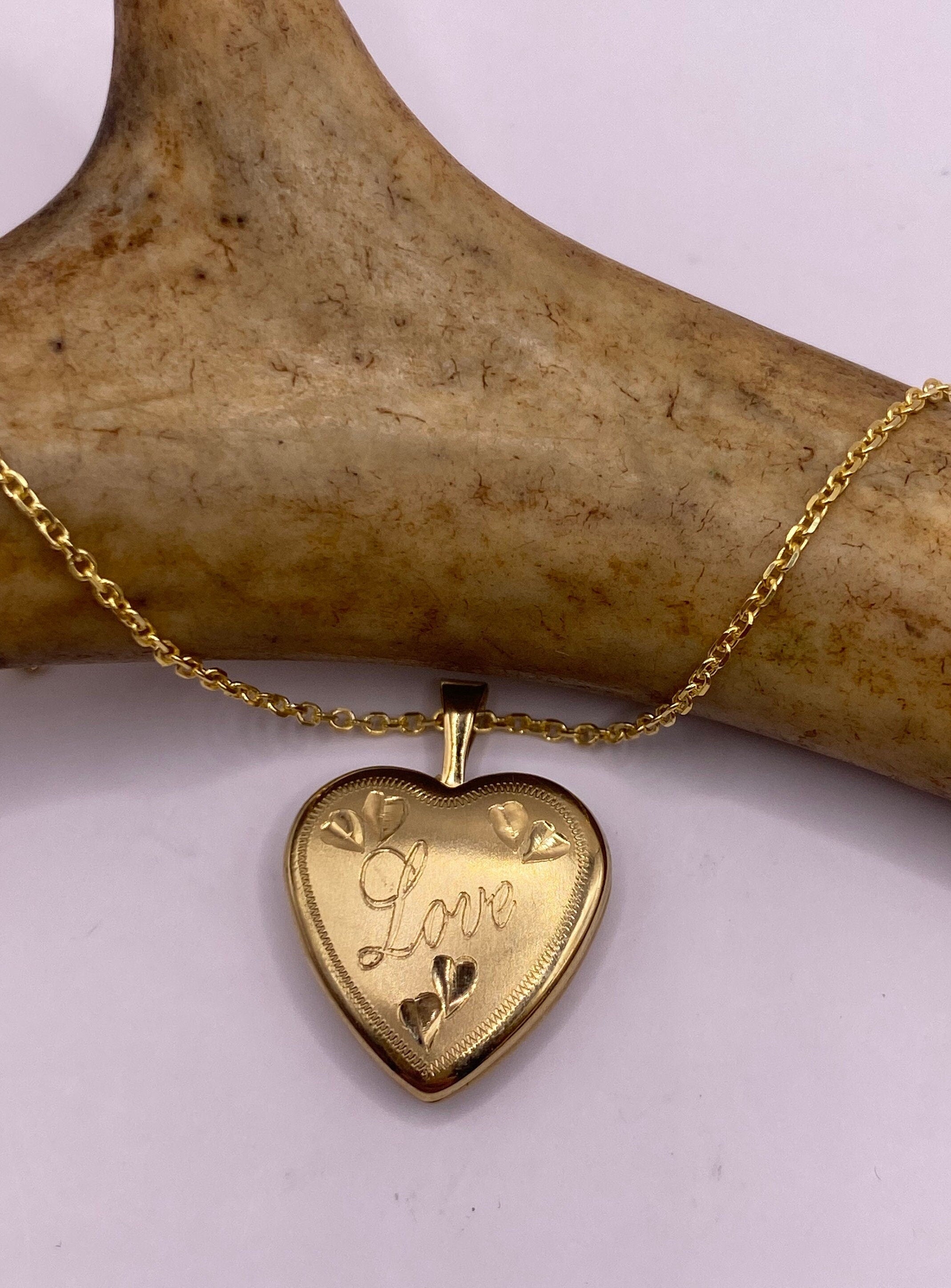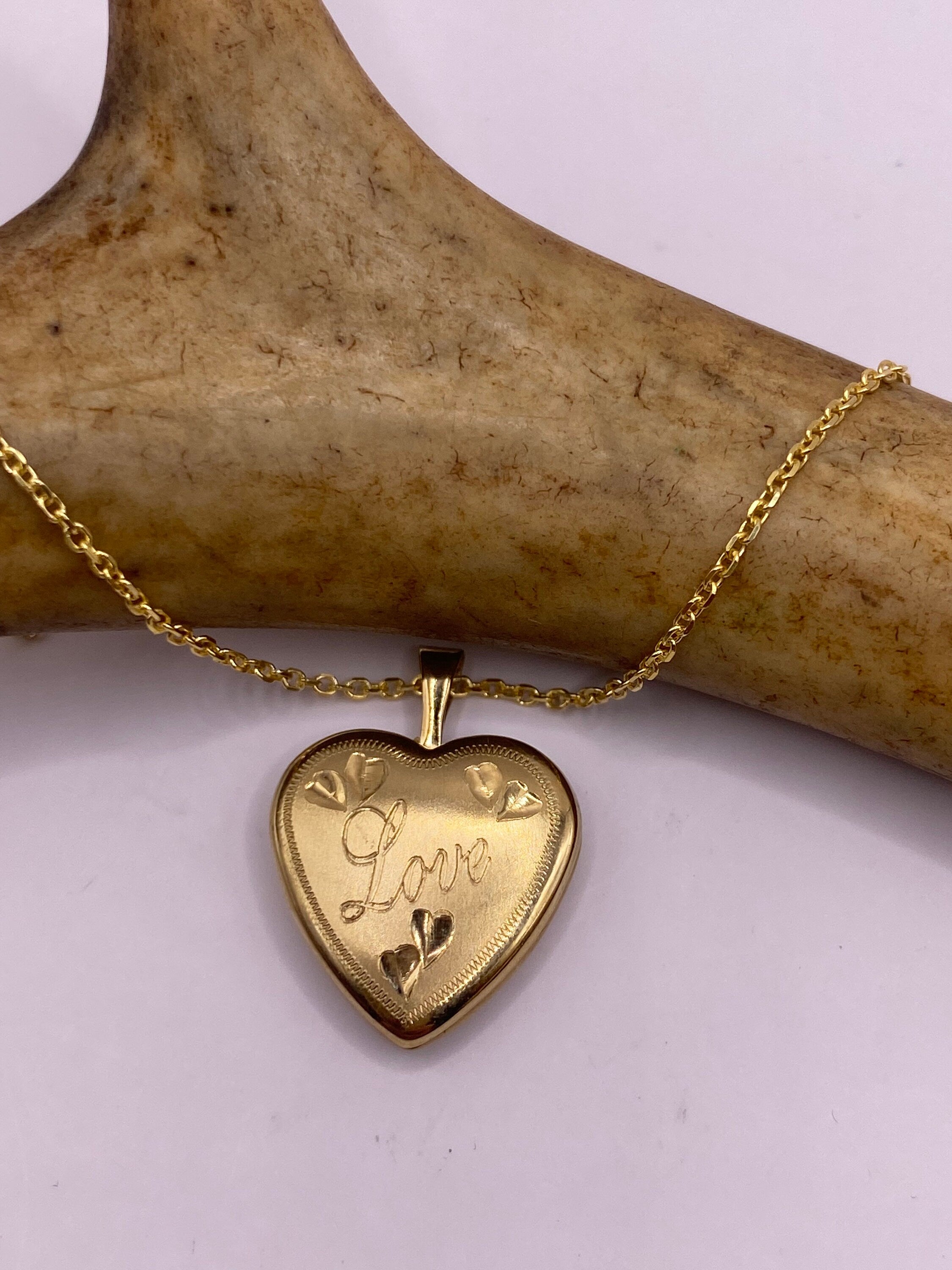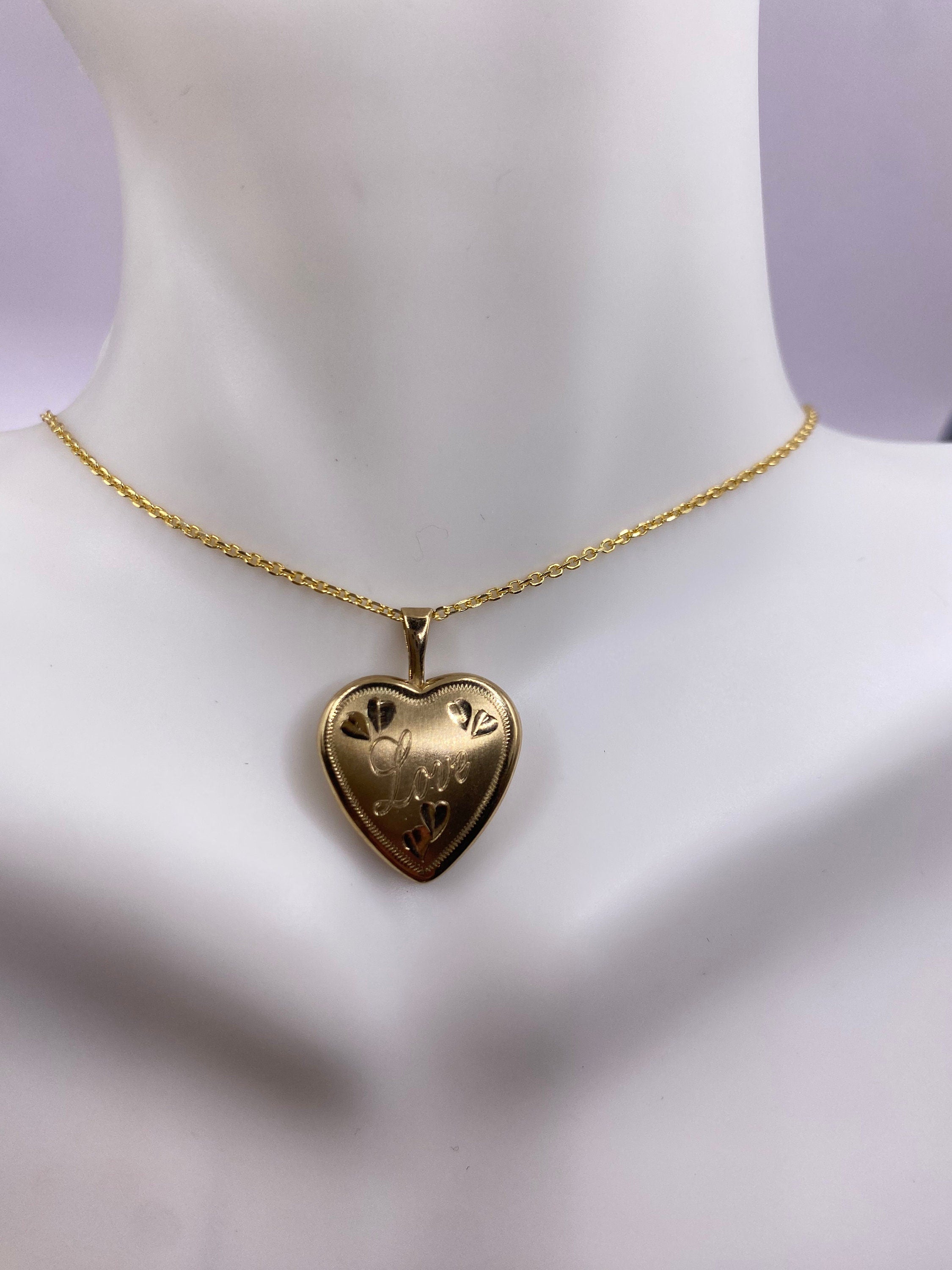 Vintage Tiny Gold Heart Photo Locket 9K Gold Filled Memory Charm Engraved with "Love" on Delicate Chain - Vintage Style Photo Necklace