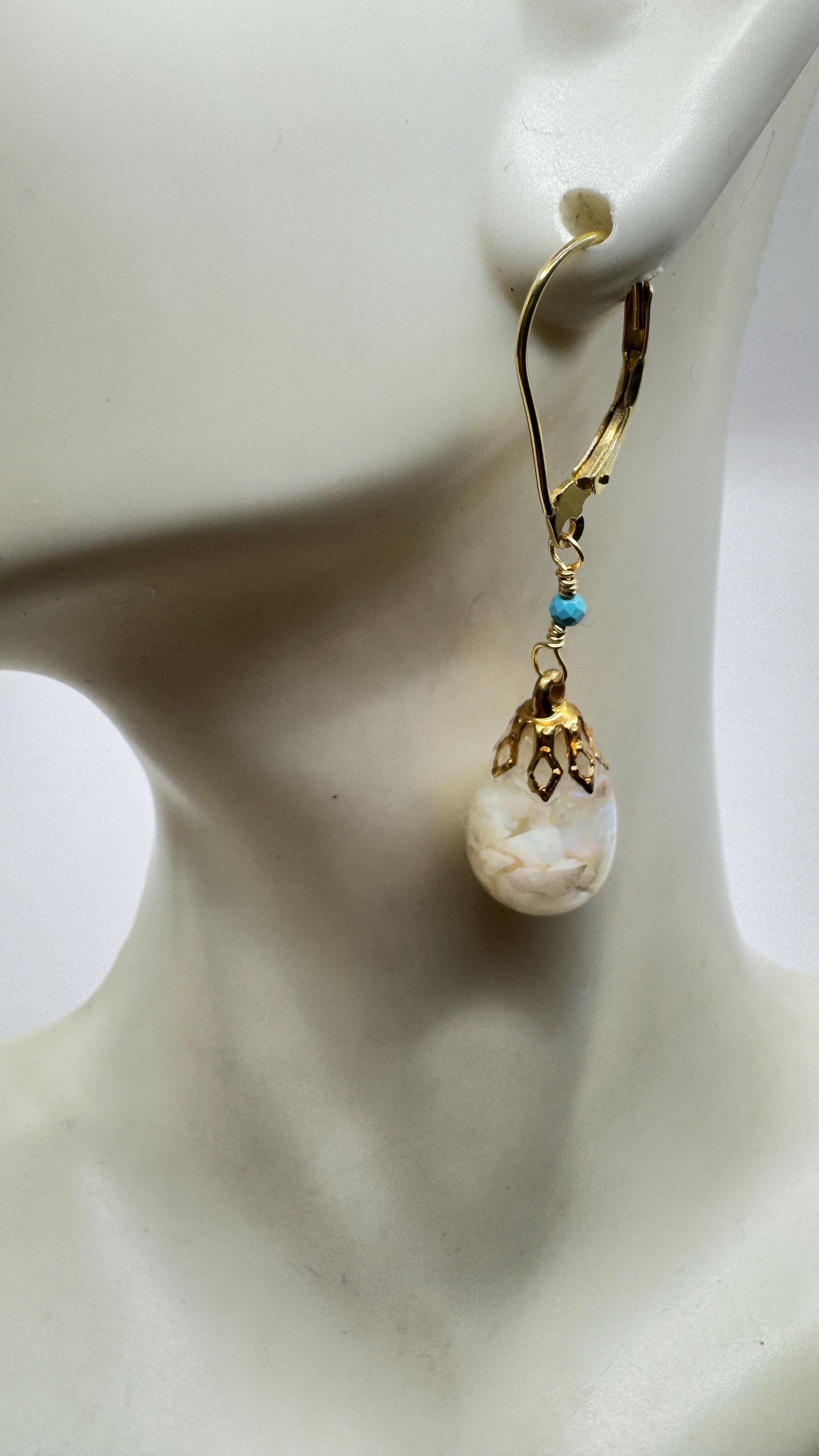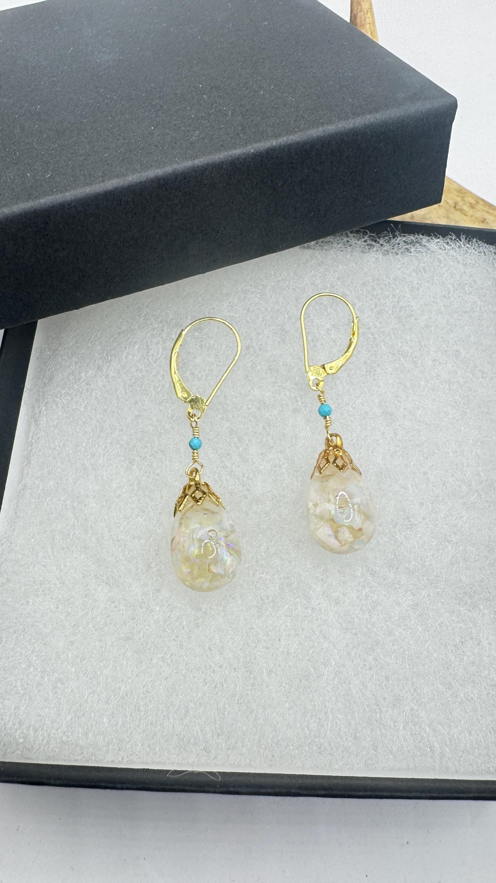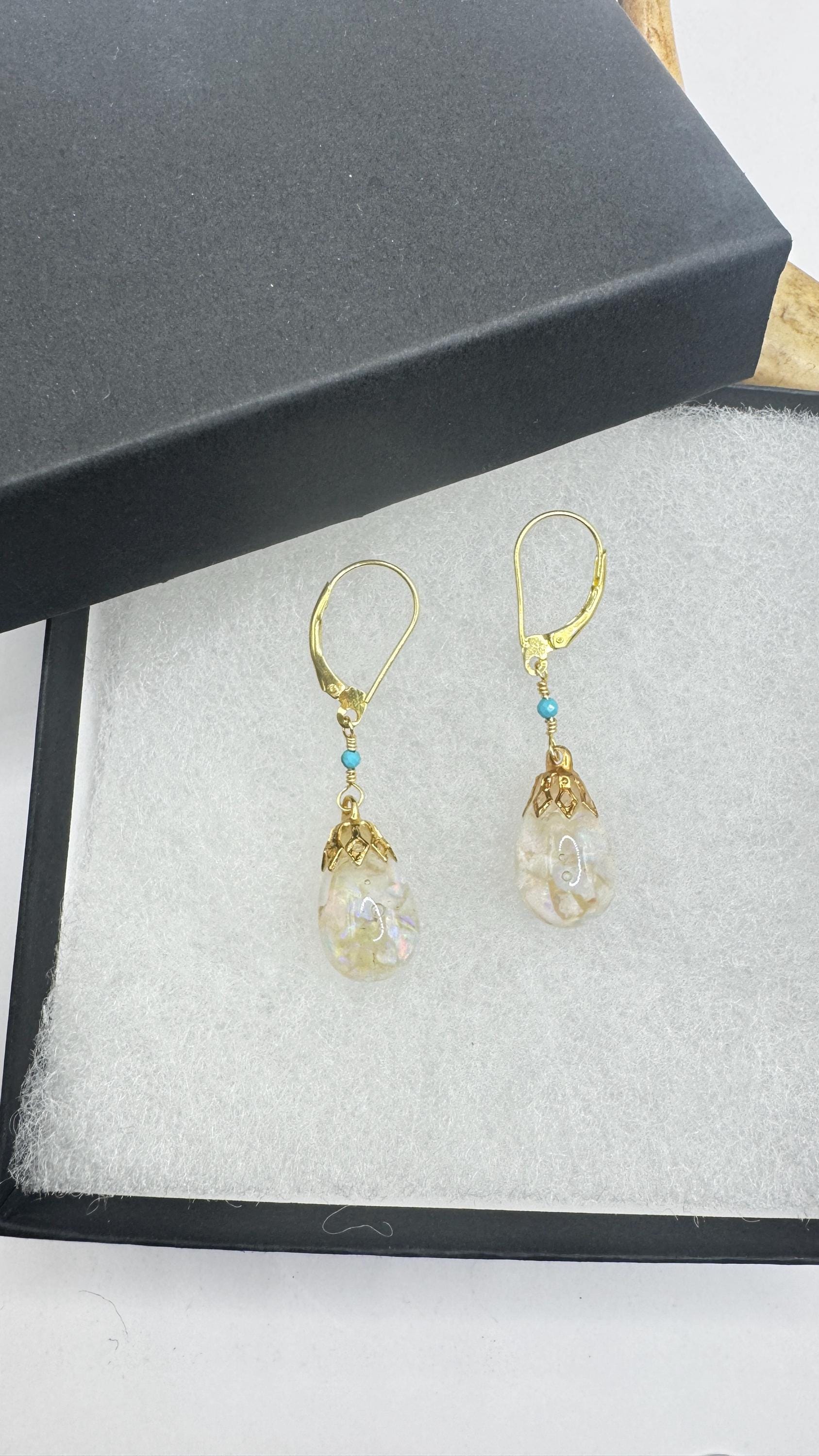 Vintage Earrings | Tiny White Fire Opal float freely encased in a glass droplet Gemstone Dainty Dangle Earrings - gold... Read more