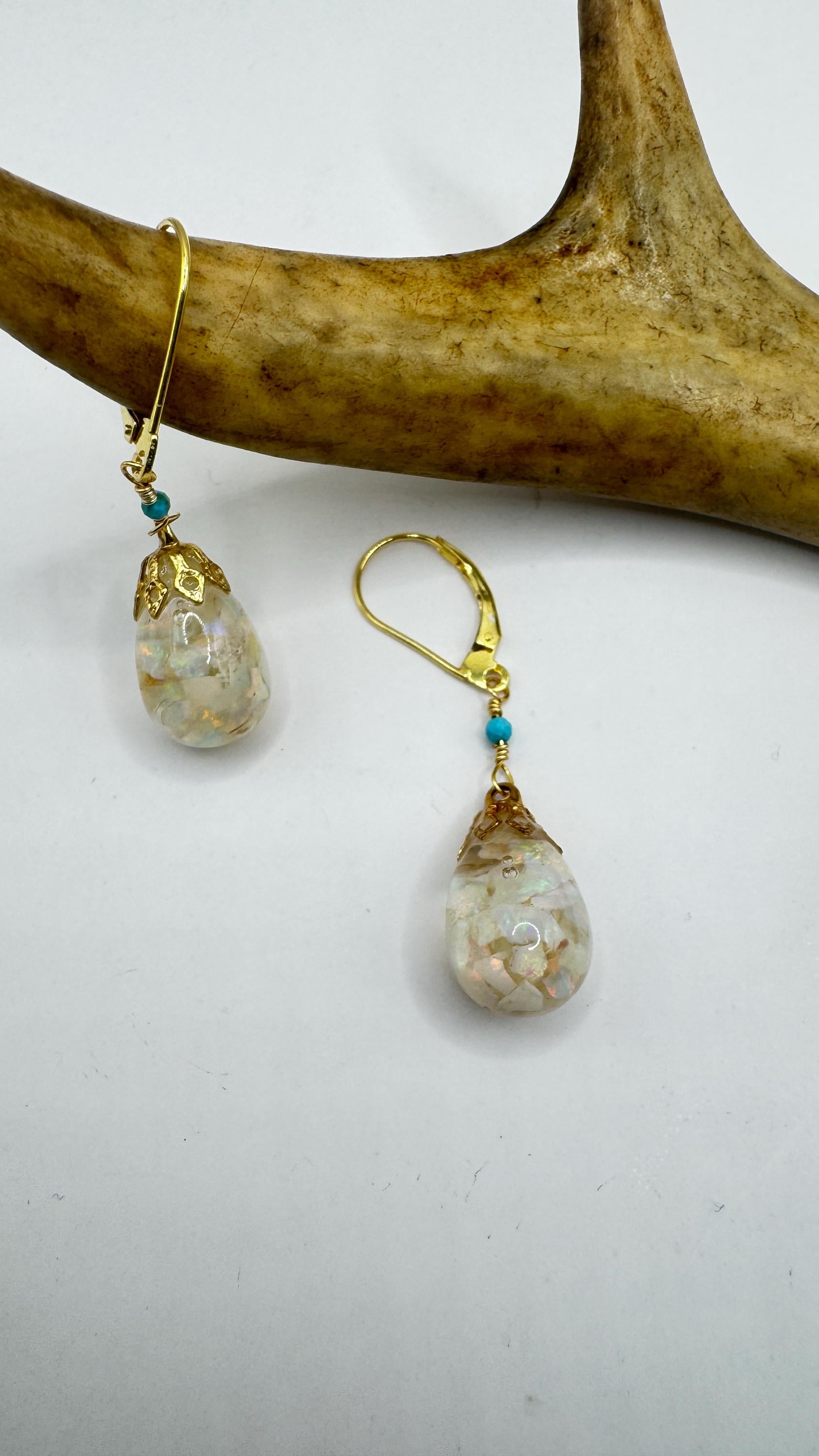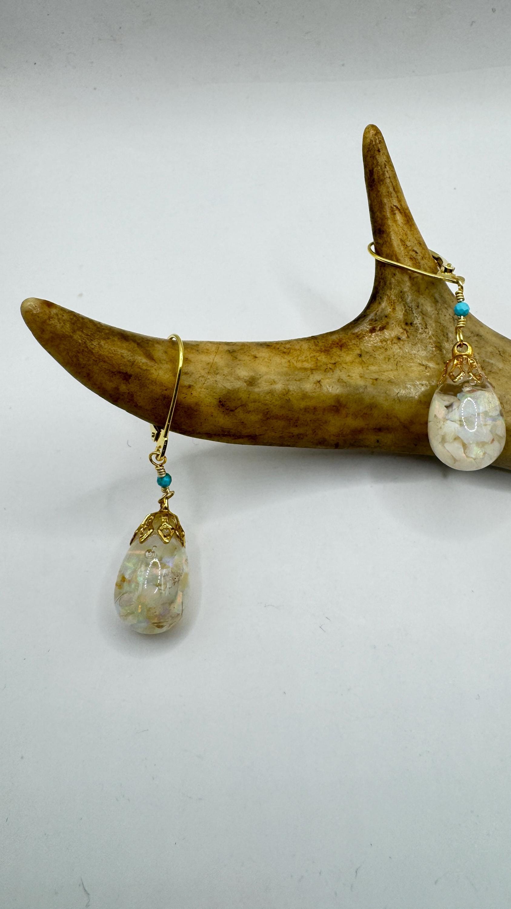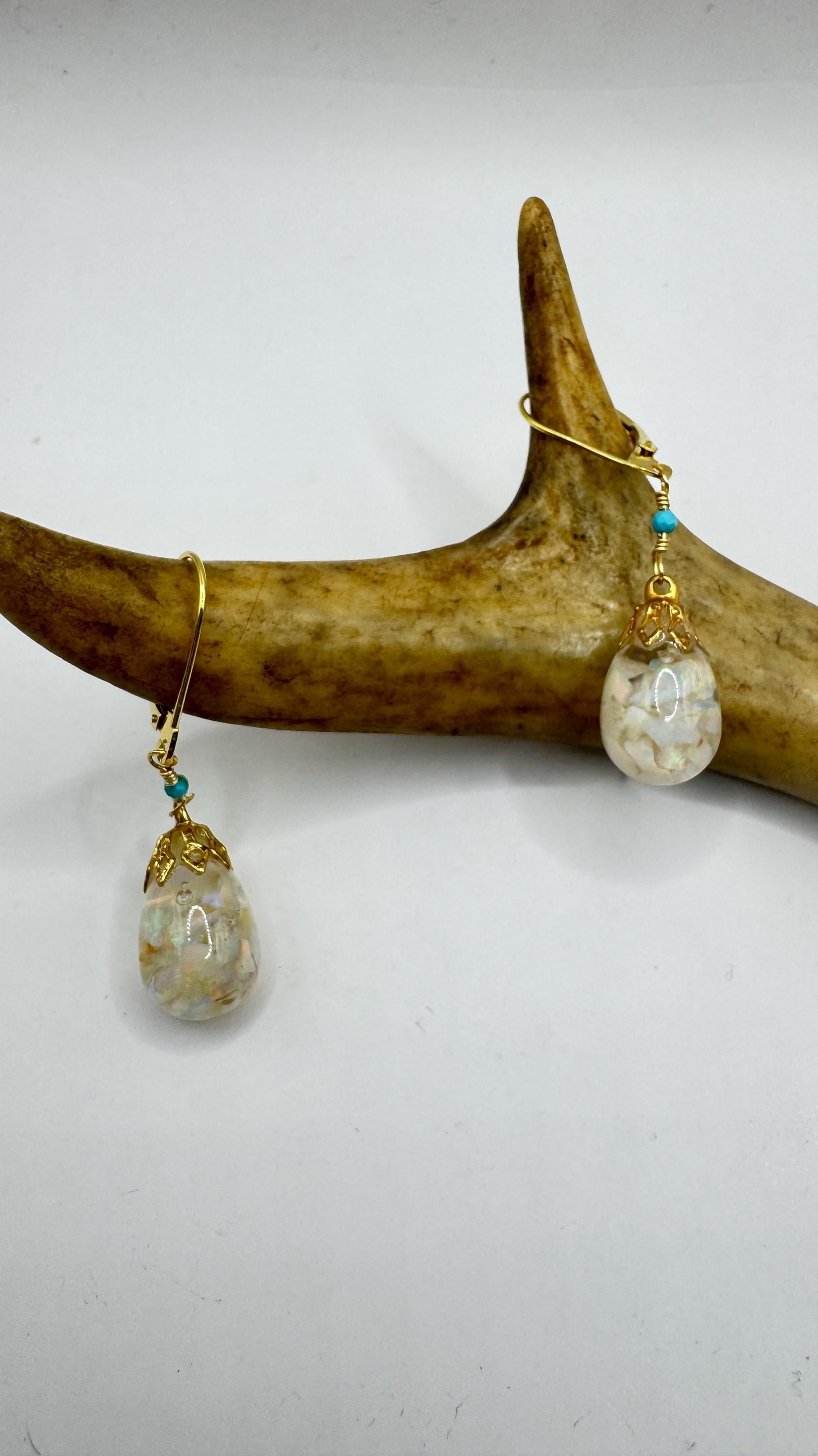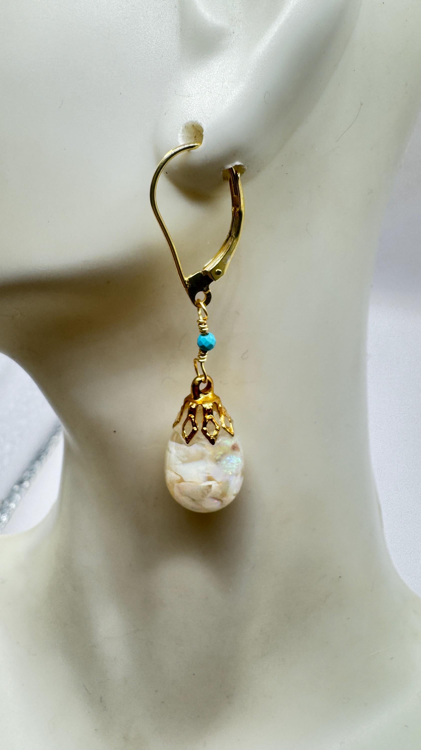 Vintage Earrings | Tiny White Fire Opal float freely encased in a glass droplet Gemstone Dainty Dangle Earrings - gold... Read more