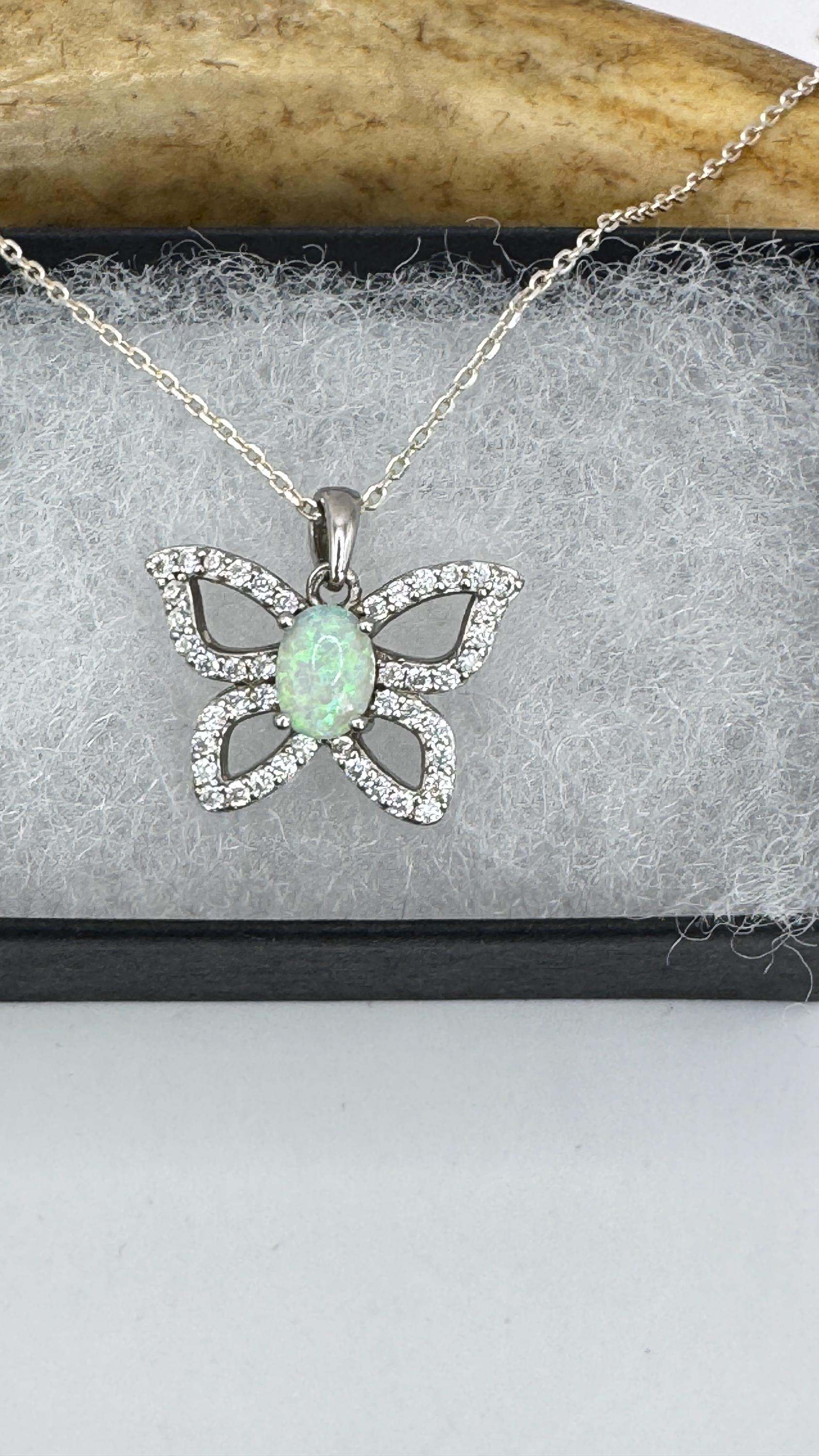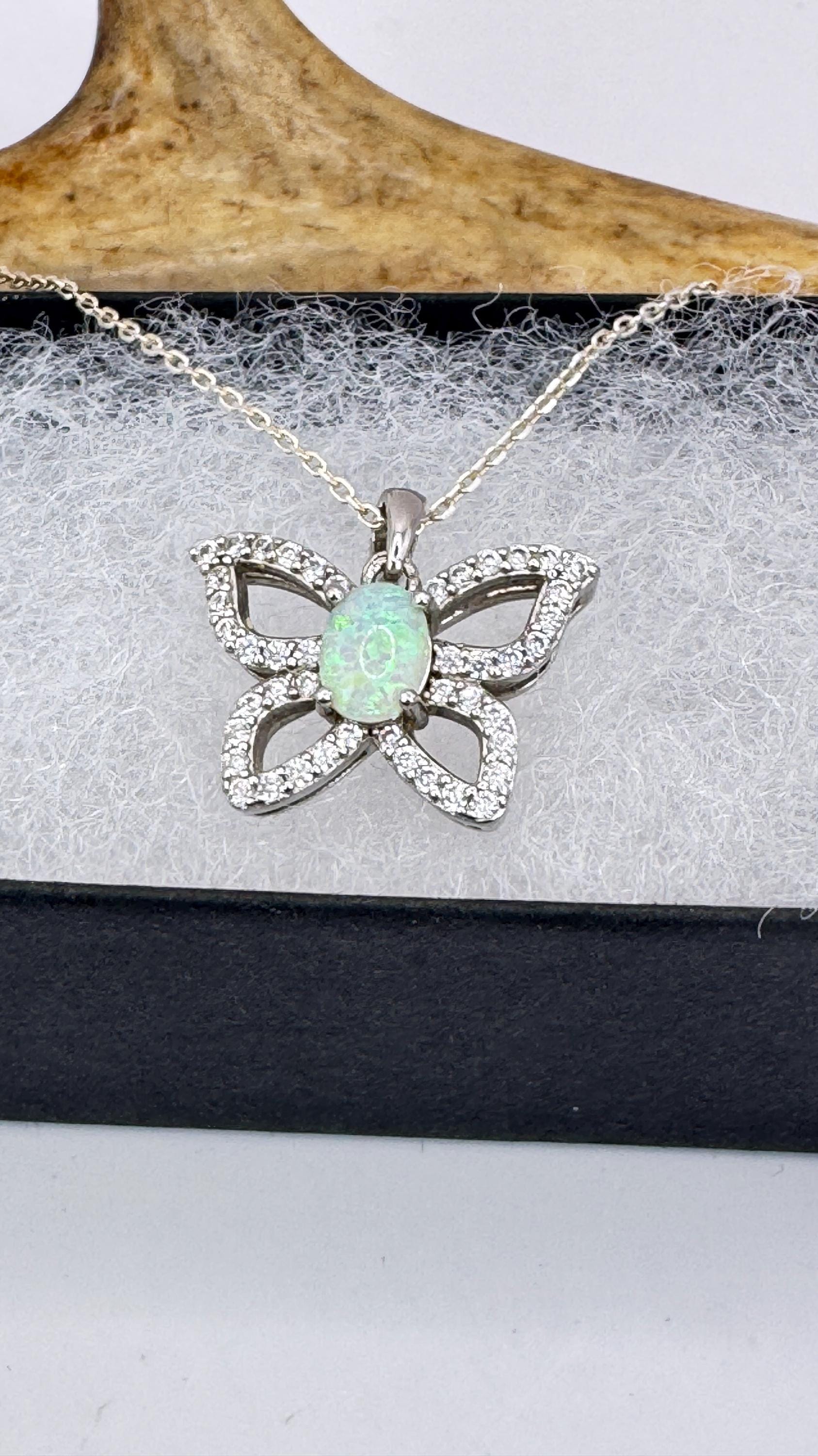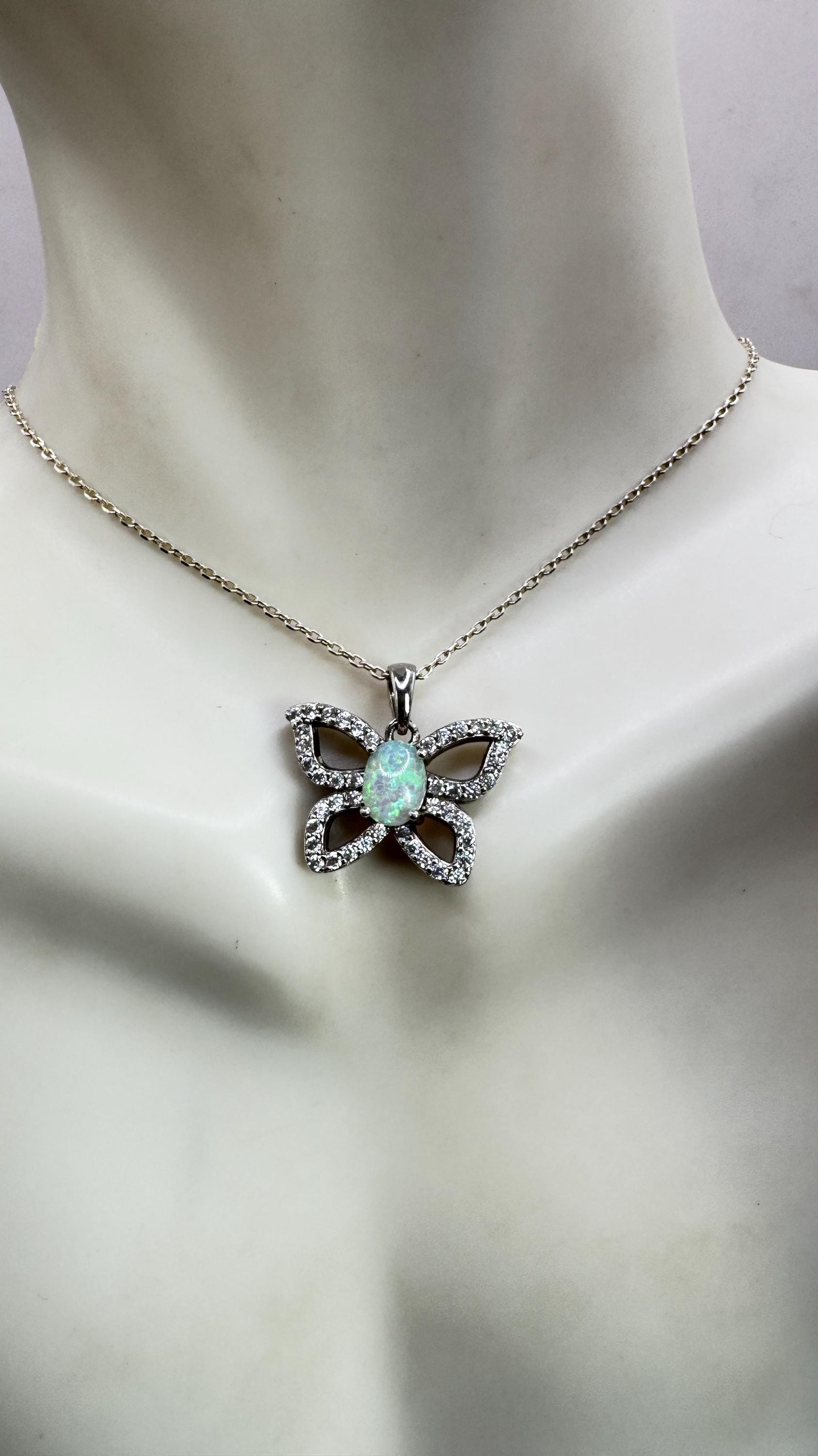 Vintage White Fire Opal Butterfly Necklace Sterling Silver Minimalist Chain