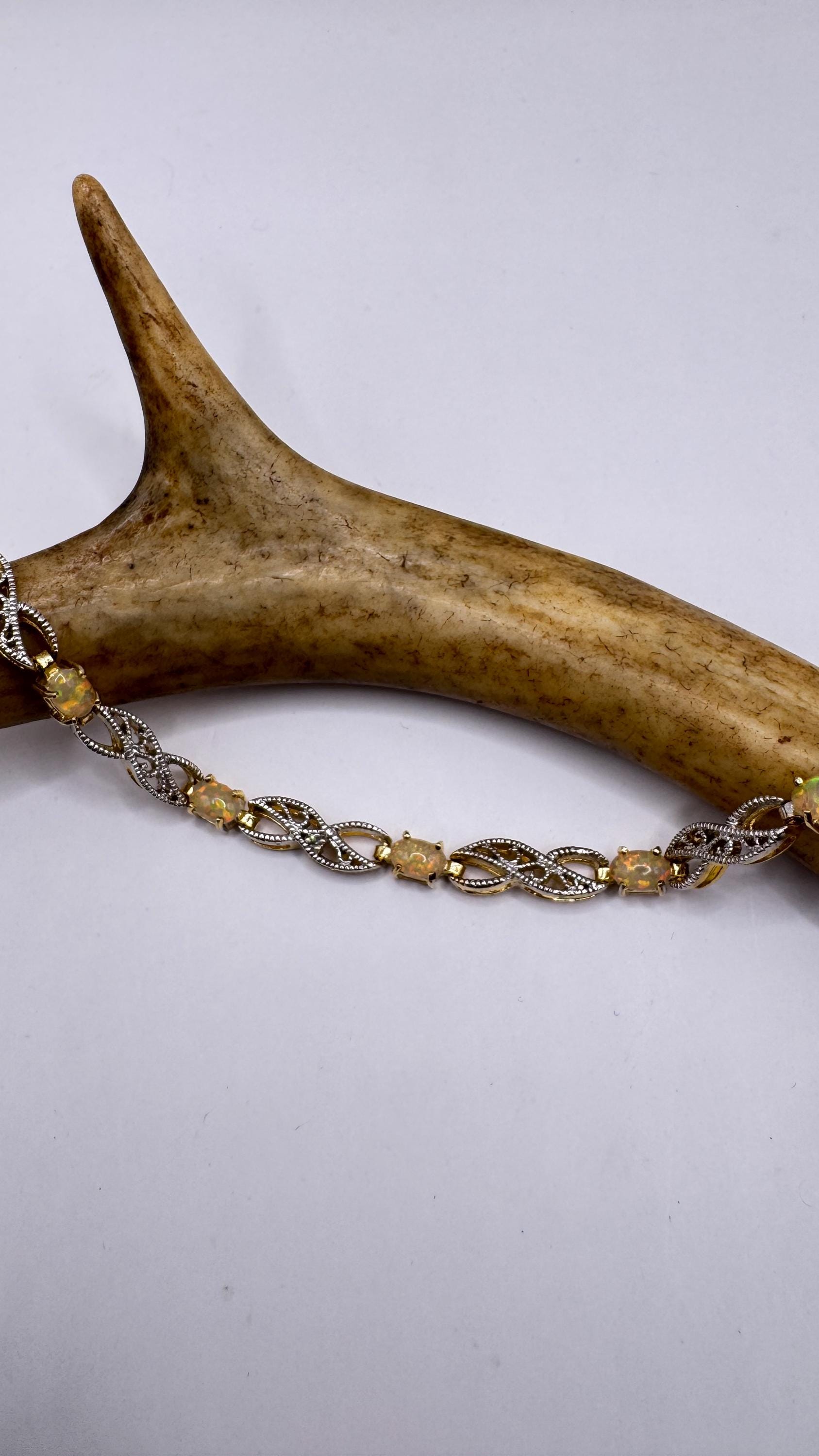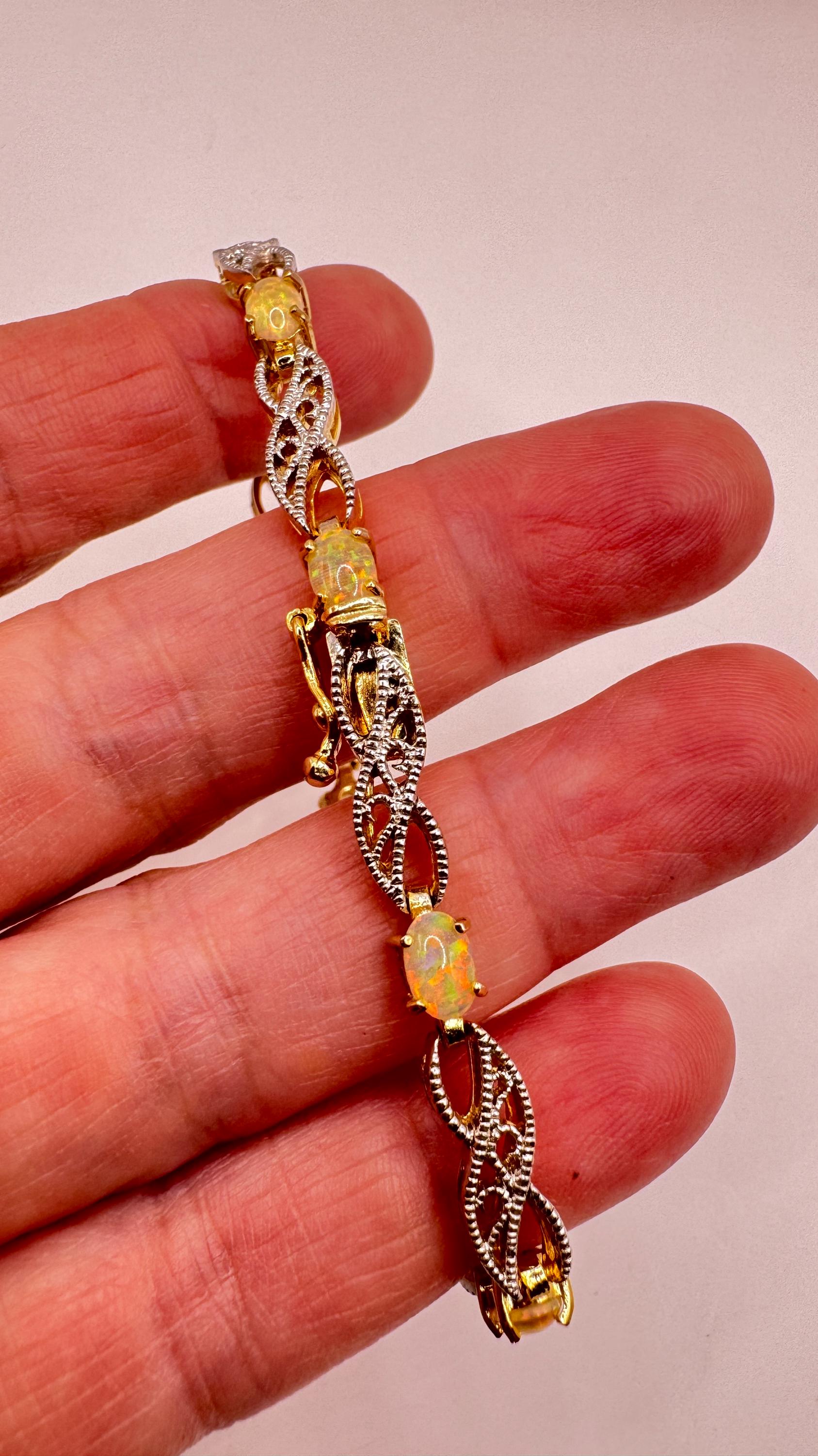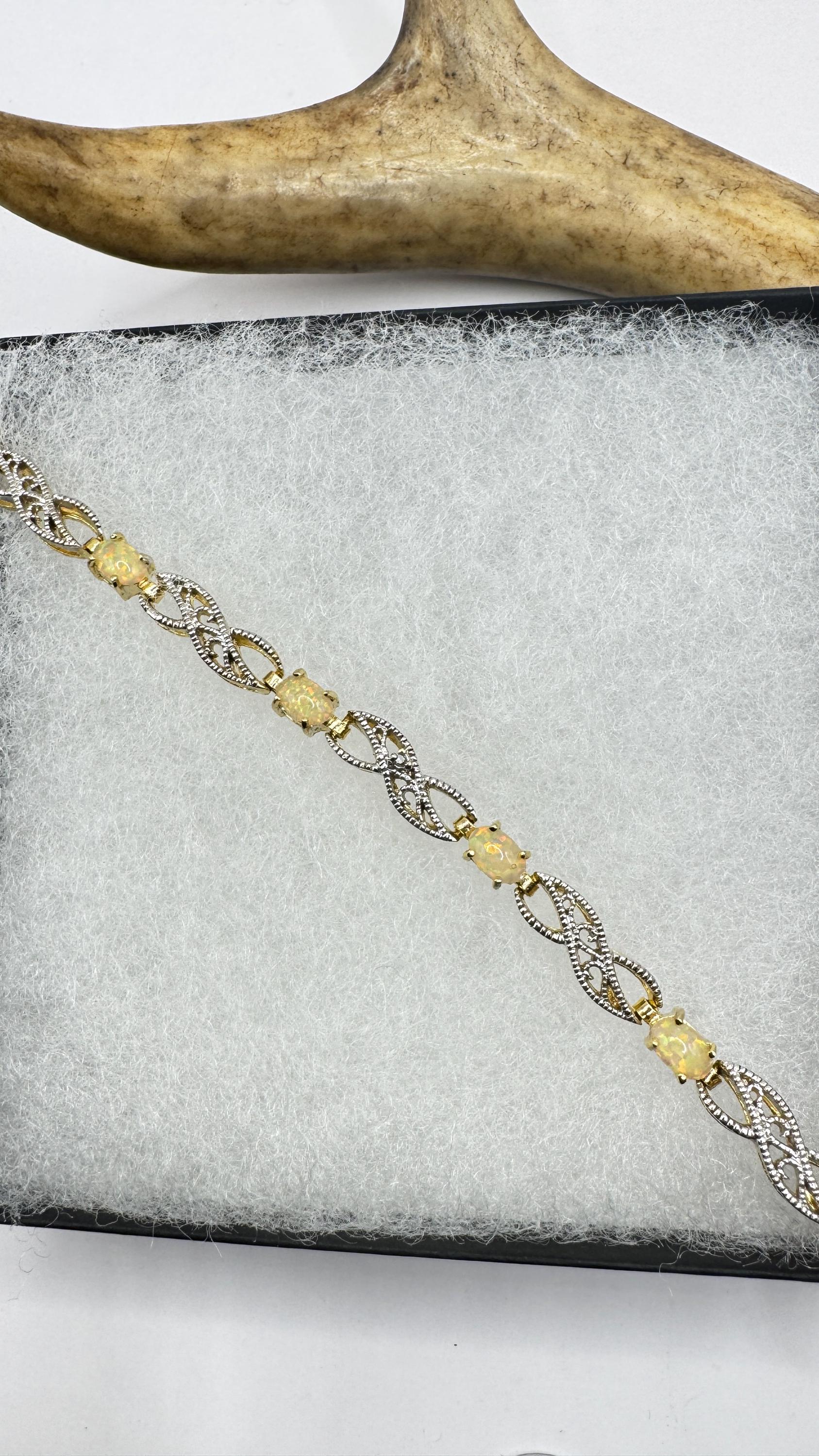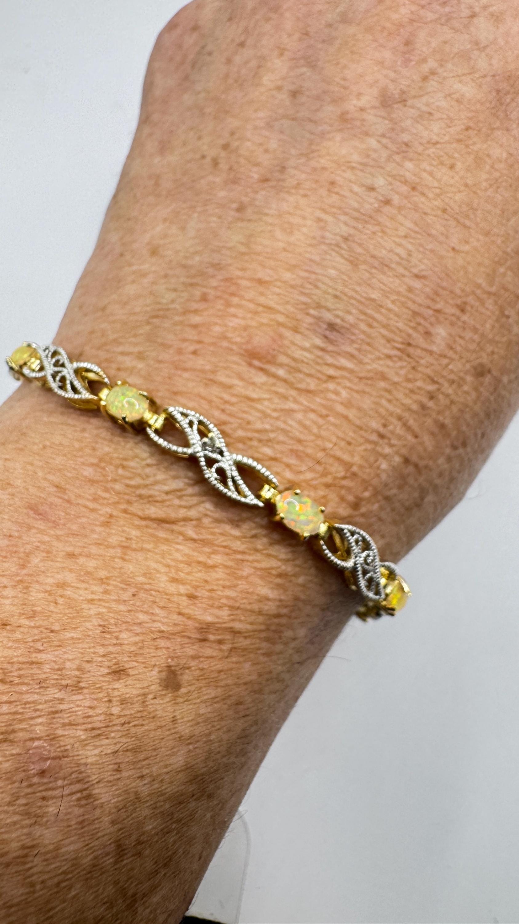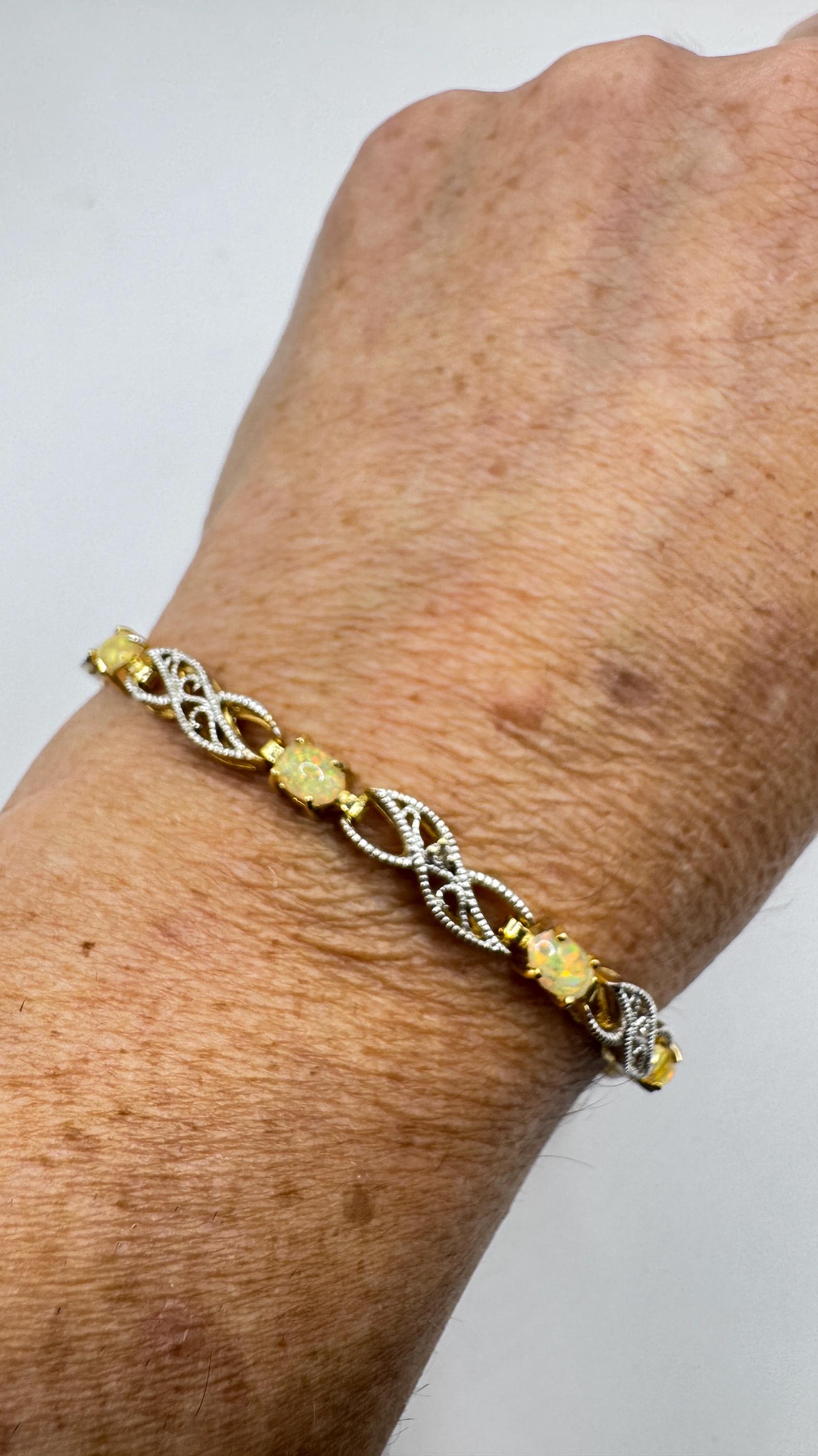Vintage White Fire Opal Tennis Bracelet crafted in 925 Sterling Silver with golden accents 7.25 inches (almost 18cm) long For... Read more