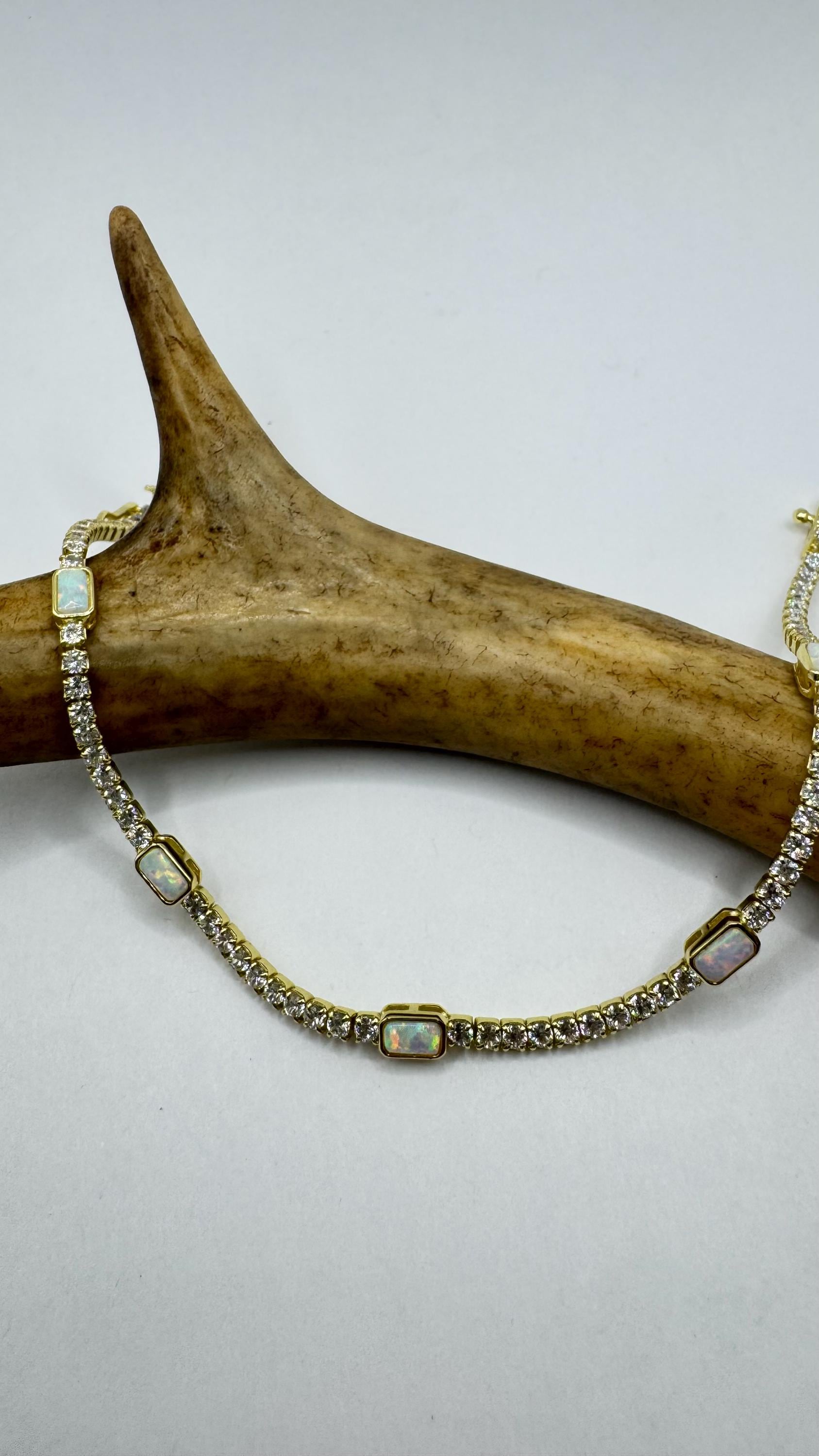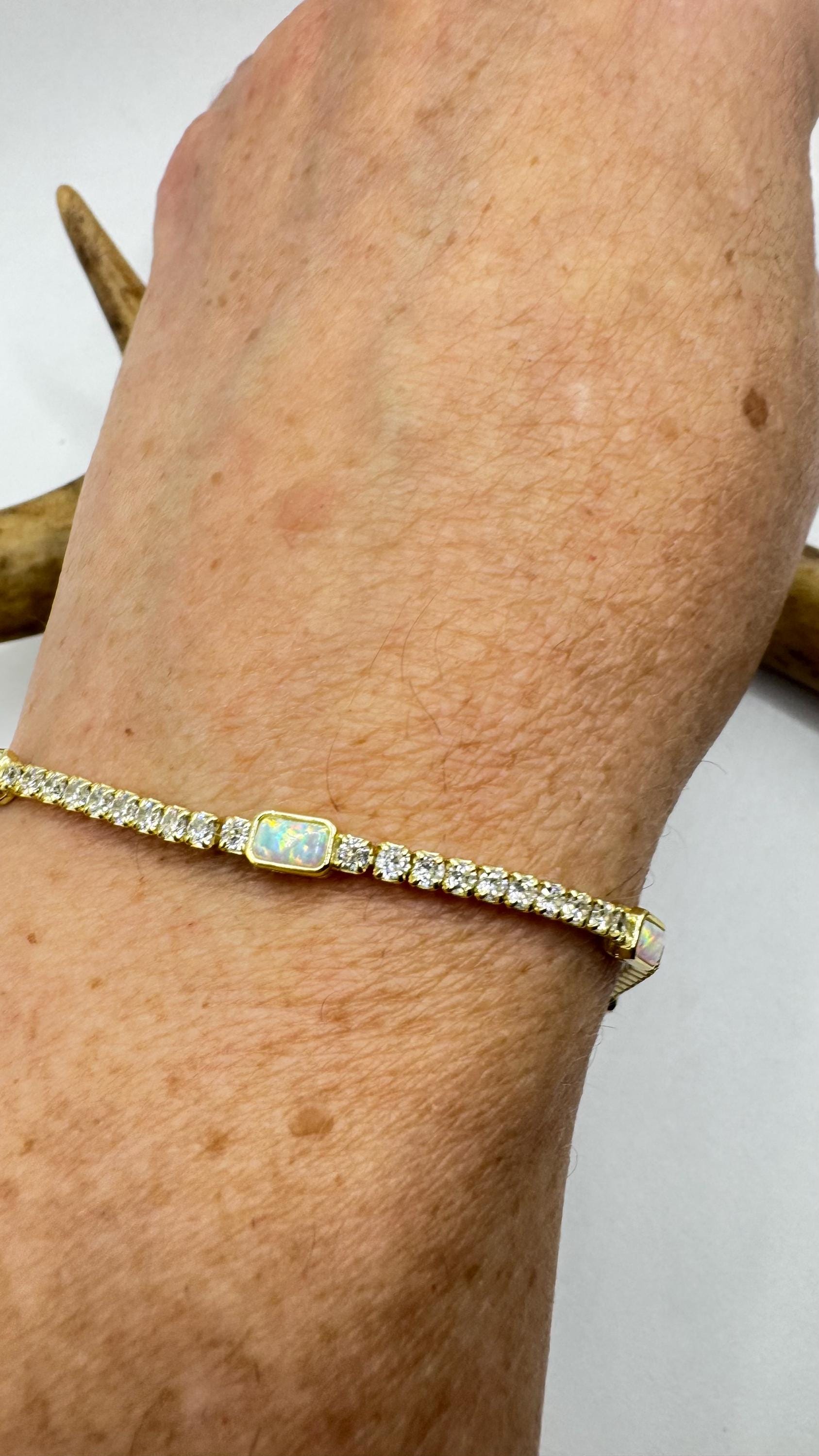 A sparkling October treasure. This white fire opal and cubic zirconia tennis bracelet is crafted in golden 925 sterling silver... Read more