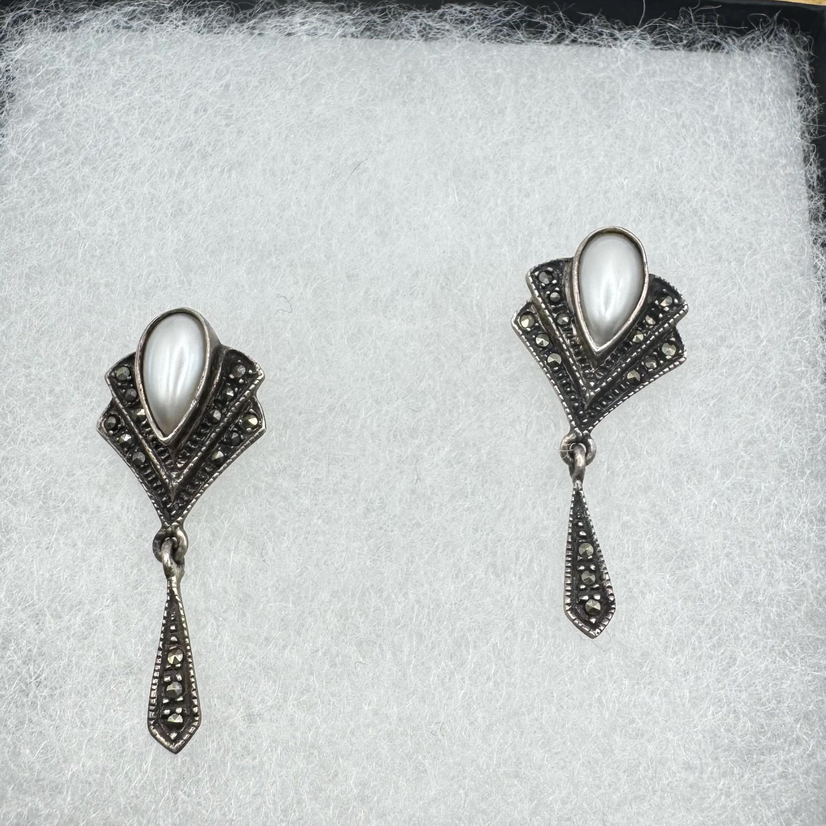 Vintage White Mother of Pearl Silver Marcasite Drop Earrings 925 Sterling Silver