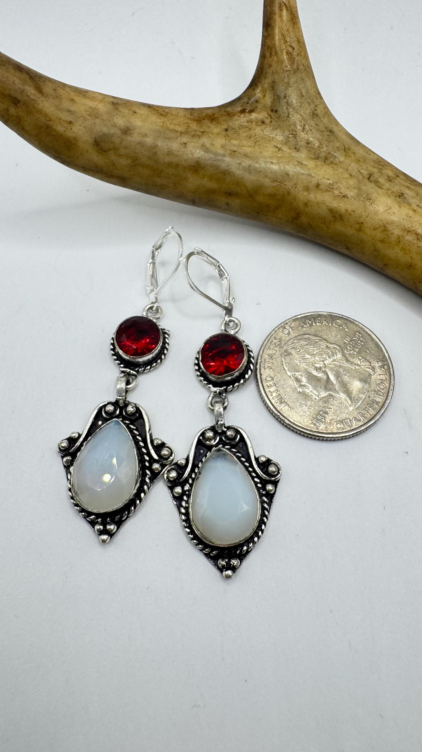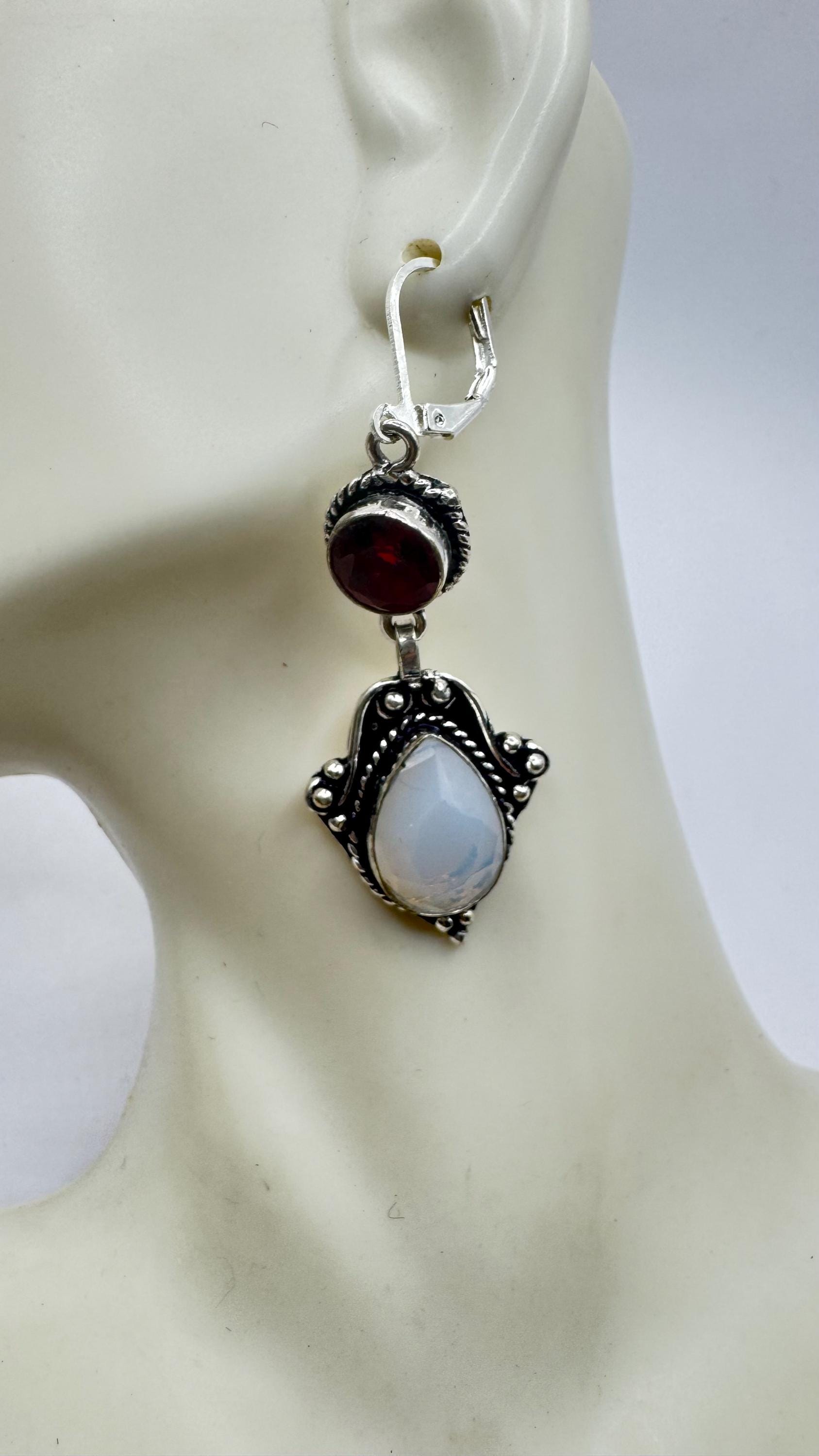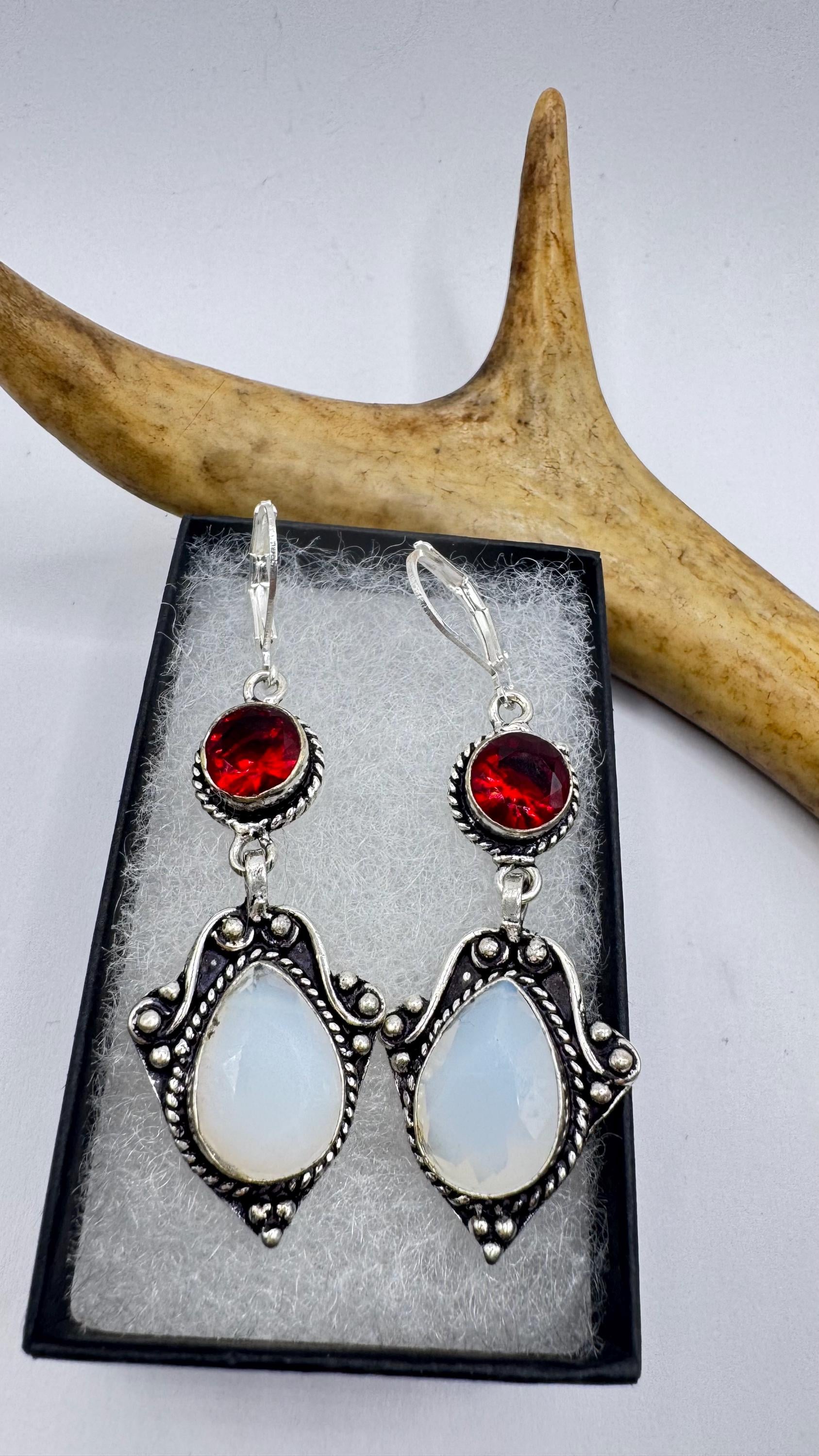 Vintage White Opal Glass Ruby Glass Dangle Earrings Sterling Silver Design Statement Leverbacks