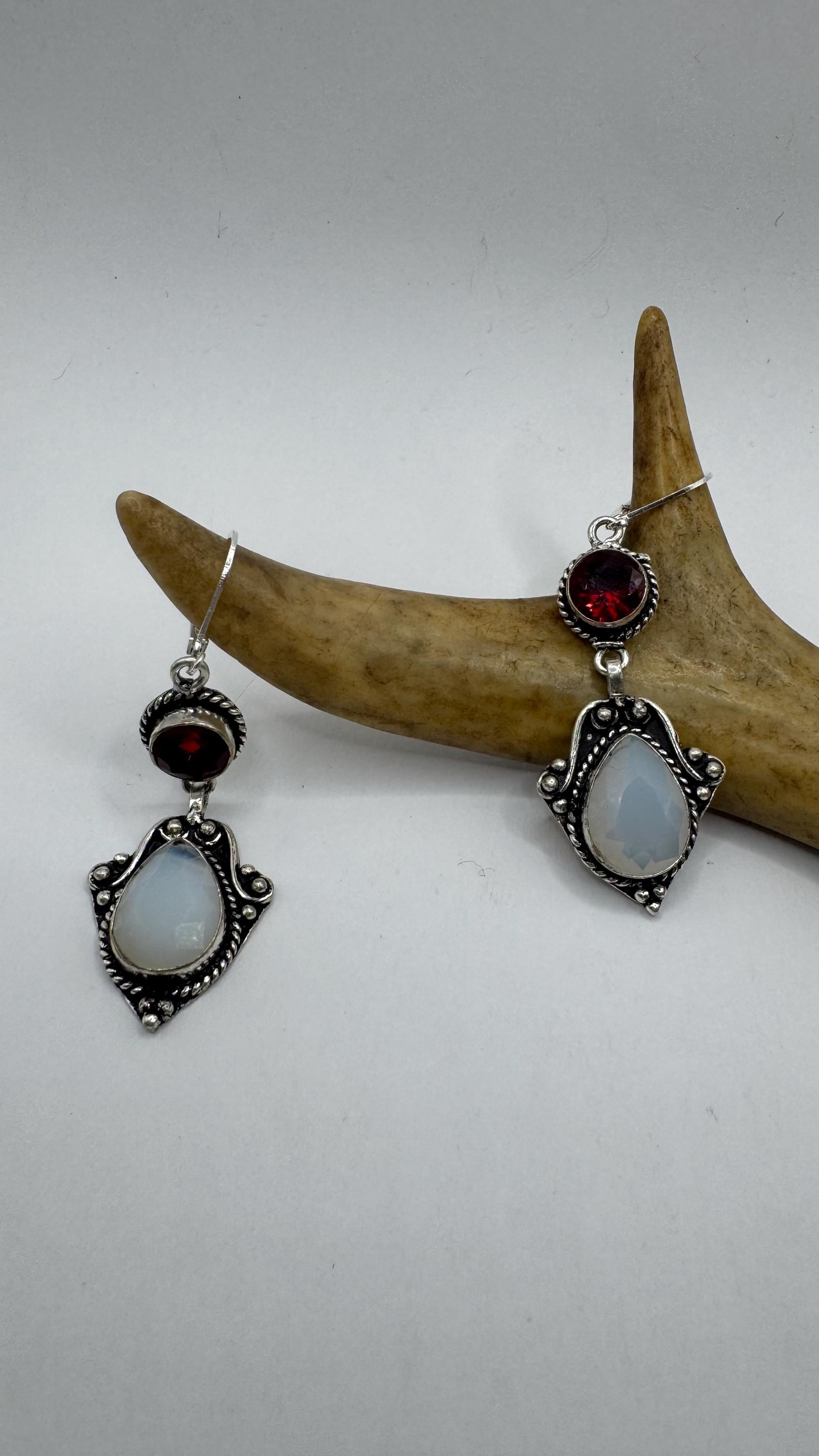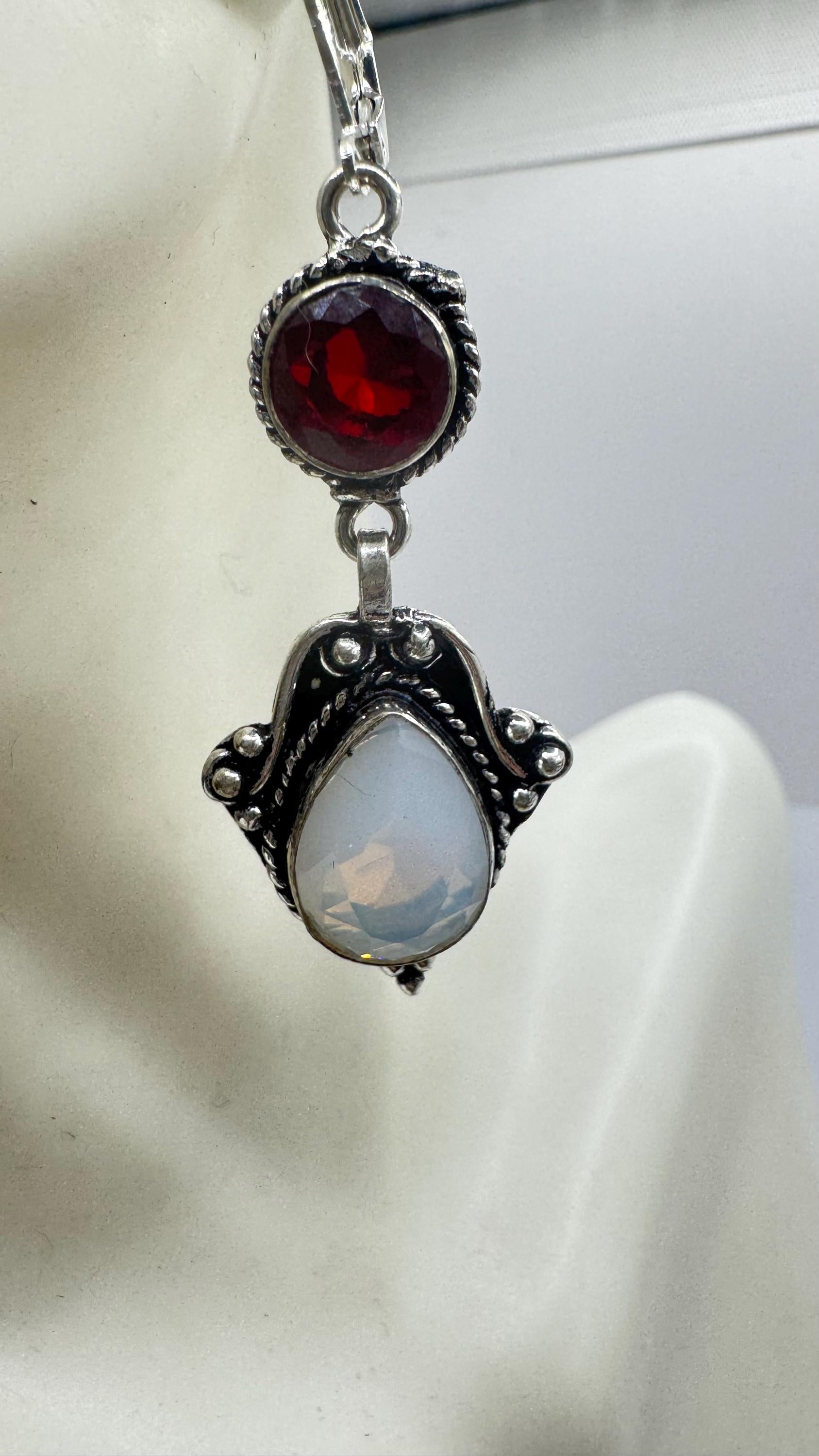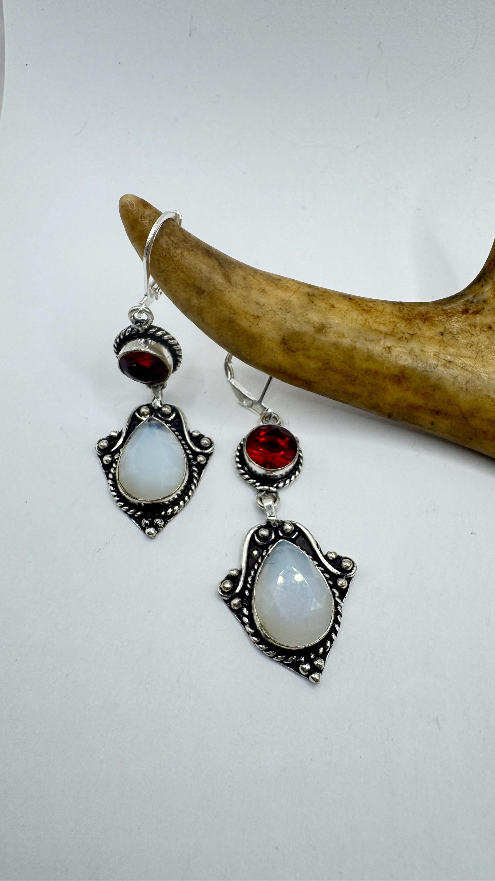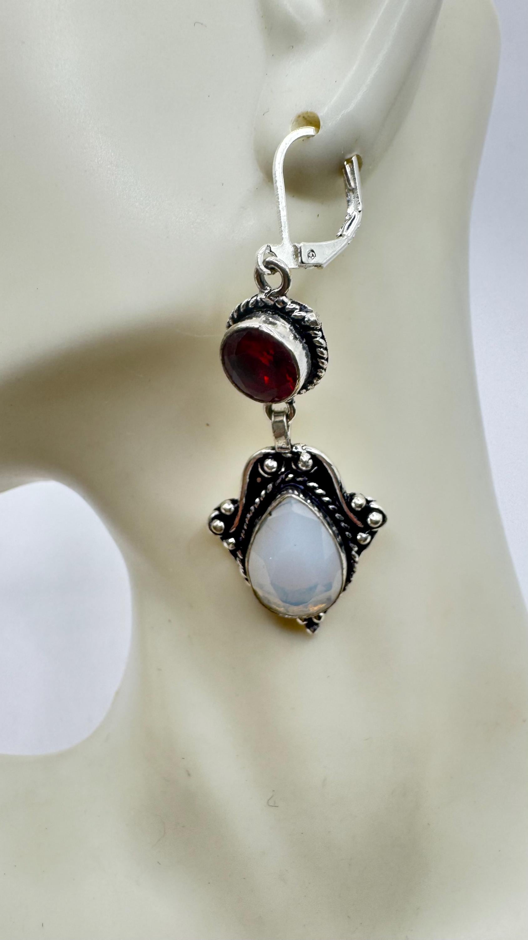 Vintage White Opal Glass Ruby Glass Dangle Earrings Sterling Silver Design Statement Leverbacks